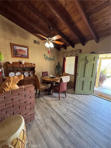 Available now in the Four Corners area of 29 Palms, this unique desert retreat with POOL and spa offers versatility, comfort, and charm—perfect for multigenerational living or anyone seeking extra space. Set on just under a 1/2 acre, the property features a beautifully landscaped courtyard that creates a private, resort-like atmosphere. The home is being rented as one property but includes two distinct living spaces: a 2 bedroom, 2 bath main home and a separate 1 bedroom, 1 bath casita. Together, they provide flexibility for extended family, guests, or creative use of space. Inside, the home’s warm adobe brick walls, wood-beamed ceilings, and rich wood paneling create a rustic yet inviting vibe, while all rooms are spacious and comfortable.