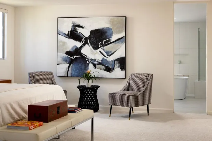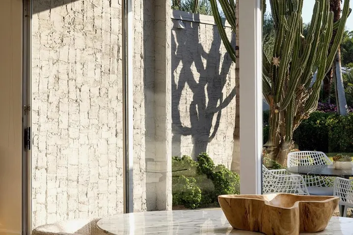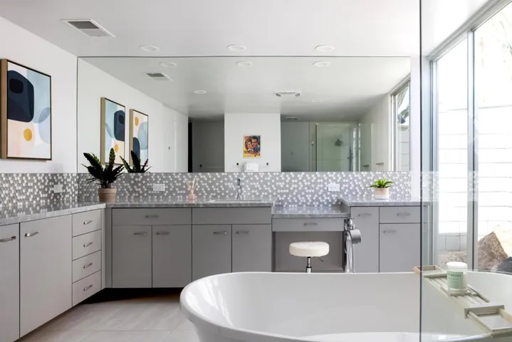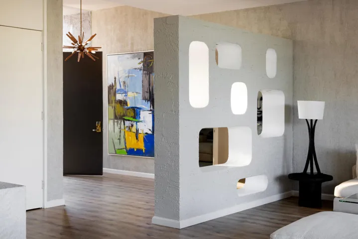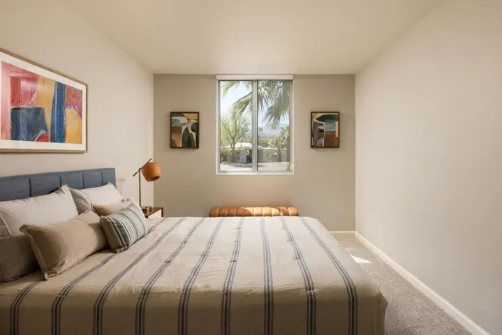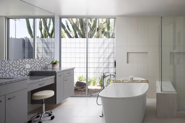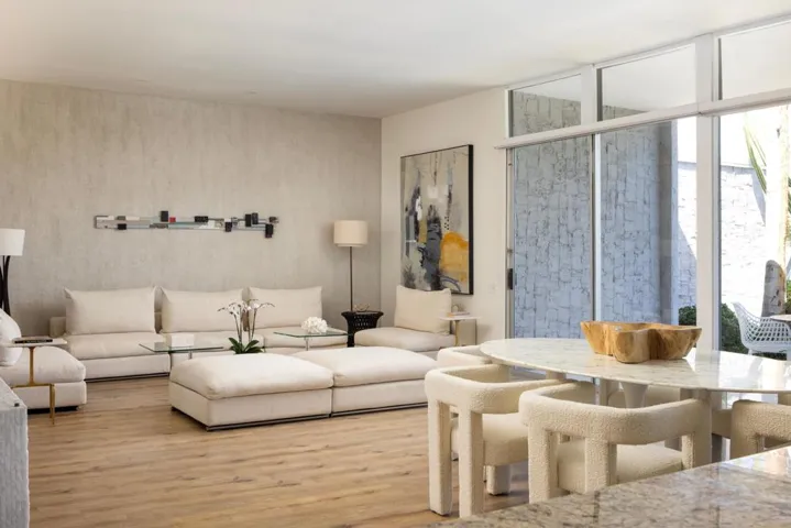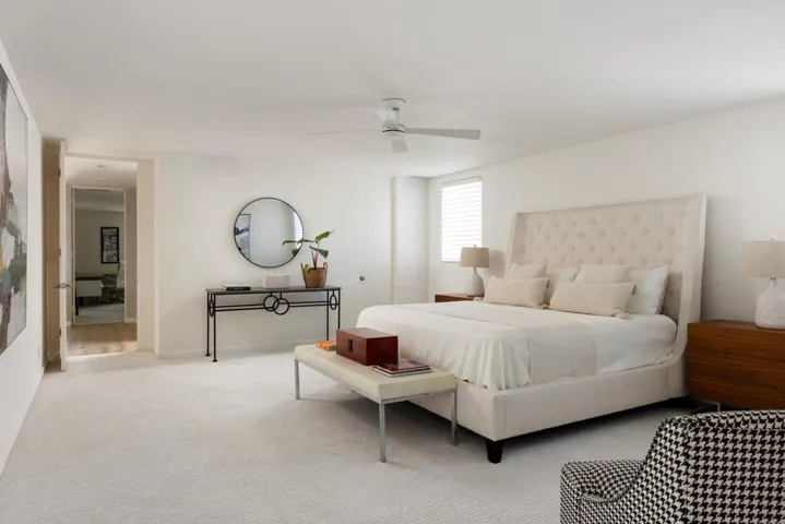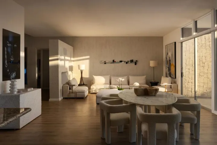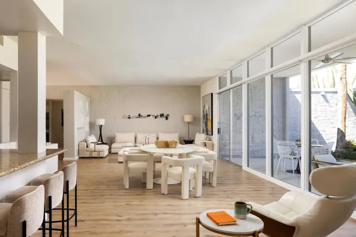 Designed and built in 1972 by legendary architect S. Charles Lee as his own residence, this home stands as a rare testament to one of America’s most influential architectural legacies. Lee (1899-1990) is best known for defining the glamour and modernity of Hollywood’s Golden Age, designing more than 400 theaters nationwide–including icons such as the Los Angeles Theatre, Tower Theatre, and Fox Wilshire. In his later years, Lee brought his creative vision to Palm Springs and the Coachella Valley, helping shape the region’s desert modern aesthetic.This residence at Tamarisk West remained in the Lee family until 2016 and served as the setting for countless family milestones, intertwining personal history with architectural heritage.Spanning over 3,100 square feet, the home captures the essence of desert modernism–light-filled, sculptural, and deeply connected to its surroundings. Distinctive design elements include Elrod-inspired wall cutouts, original raked stucco finishes, and dramatic floor-to-ceiling glass walls framing panoramic desert views.The flexible floor plan features 3 bedrooms and 3 full baths, a generous media room (easily converted to a 4th bedroom), and a versatile studio with private entrance ideal for guests, creative use, or remote work. The updated kitchen and spa-like primary bath blend modern comfort with original architectural integrity.Set on a private corner lot with an extended driveway and secluded yard, this home offers both privacy and convenience–steps from lush community grounds and direct gate access to Tamarisk Country Club, where golf, tennis, pickleball, and luxury amenities await.One of the largest and most significant homes in Tamarisk West, the S. Charles Lee Residence is more than a property–it’s a piece of architectural and cultural history, offering timeless design, low HOA dues, and leased solar for modern efficiency.