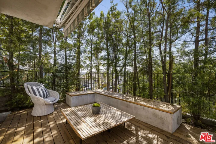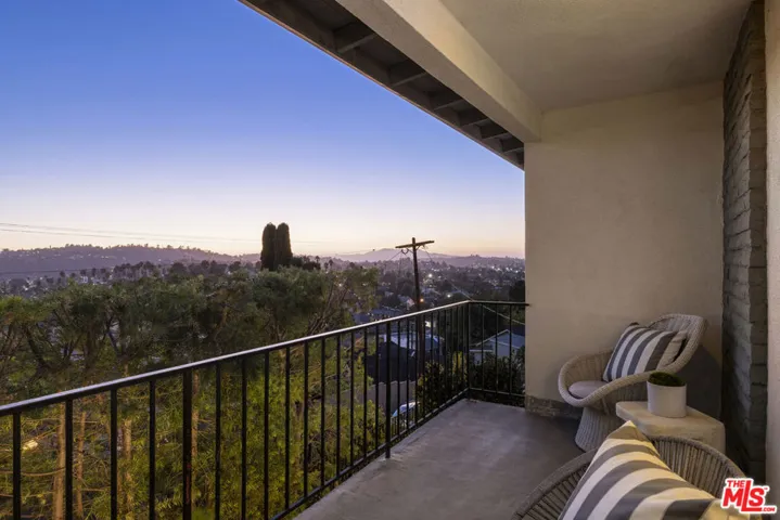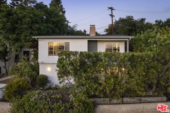 Located at the top of Mount Angelus, one of Highland Park’s most coveted enclaves, this captivating c1957 Mid-Century modern home offers superb original details, endless natural sunlight, spectacular downtown skyline views, and total privacy; ensconced among tall trees on a street to street lot and feels like you have no neighbors. Enter the property from the end of the cul-de-sac at the peak of the hill on Wayland St, where there is a 2 car garage and two entrances at street level. (La Follette Drive is below the property.) Front walkway leads to main entrance and large living room with stunning character fireplace and hearth, original hardwood floors, ample dining area and spacious walk-out balcony with panoramic 180 views of greenery, architecture, and the hills– capped by the downtown LA skyscape. Kitchen with separate entrance offers new cork floors, new appliances and cool vintage cabinetry. Featuring hardwood floors and large windows framing breathtaking views, the primary suite is spacious and private. The lower level features a large family room with abundant custom shelving from HP’s Matters of Space, and two exterior entrances: one entrance to the side stairs; plus sliders opening to large deck and yard/garden–perfect for outdoor entertaining. Built-ins; ironwork, magnesite stairs, original doors and many other details give this beautiful home a true classic feel. Large laundry and utility room also opens to the outside. Explore endless local eateries like Bub and Grandmas and Joy; and walk to rec center, music venues and theaters. Feel space, privacy and nature with the city at your fingertips: centrally located to downtown, Pasadena and Glendale.