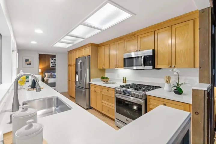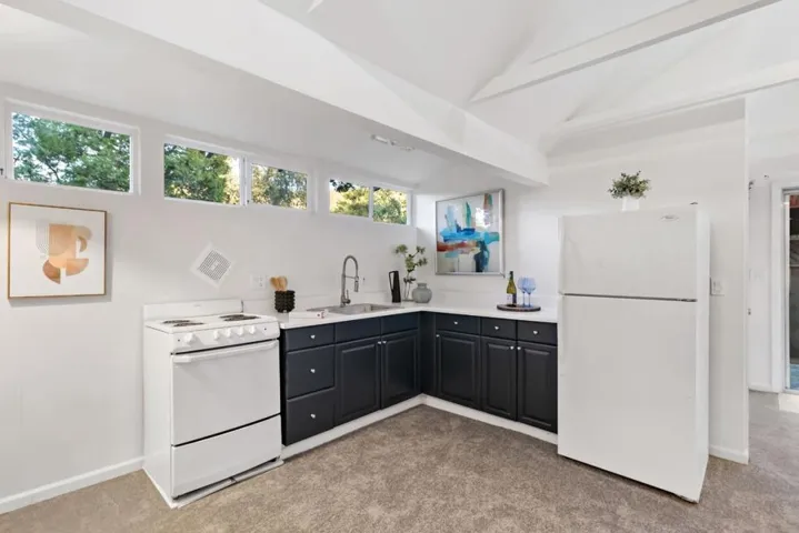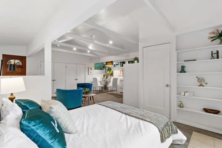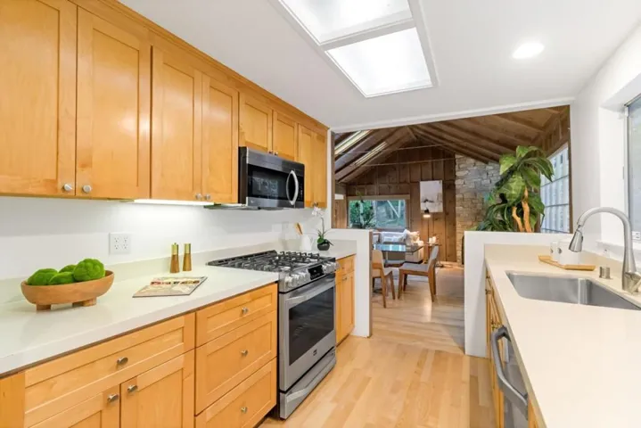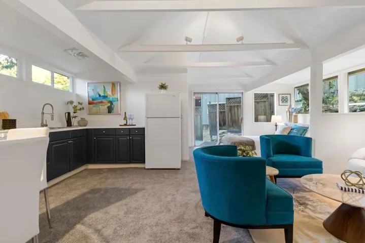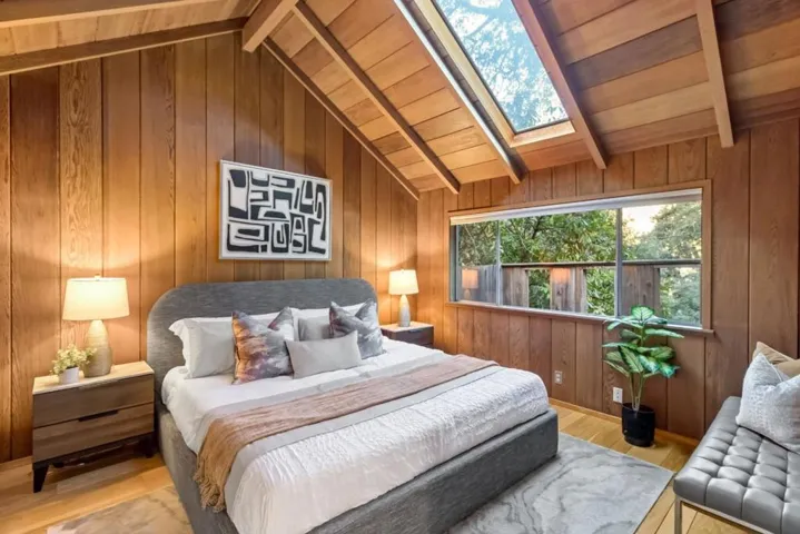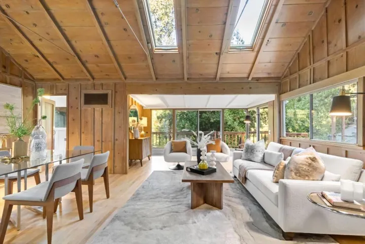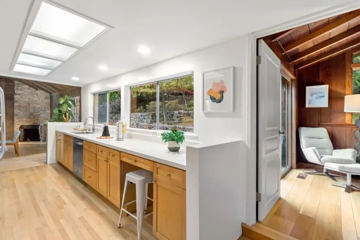 Discover the perfect blend of nature and modern convenience at 1019 Los Trancos Road in the peaceful Los Trancos Woods neighborhood. This charming home, built in 1930, offers 1,770 SF of versatile living space (per the Seller) in two buildings with freshly painted exteriors. The 1,225 SF main house features three bedrooms and two baths, with vaulted ceilings and skylights that invite abundant natural light. The airy living room, featuring exposed beams, seamlessly transitions to a large deck and patio, ideal for indoor-outdoor entertainment. The galley kitchen is a chef’s delight, featuring stainless steel appliances and ample cabinetry that overlooks the garden. A 545 SF studio is situated behind the one-car garage. While not reflected in the County records, the studio is a flexible space with a kitchen, stacked washer/dryer, full bathroom, new wall-to-wall carpeting, and a private deck – ideal for multi-generational living, working from home, or generating rental income. Positioned on a generous 9,360 SF parcel, you’ll enjoy peaceful views and easy access to Portola Valley’s lively Town Center and Highway 280 for easy commuting.