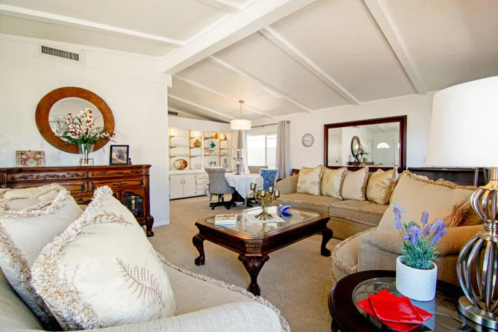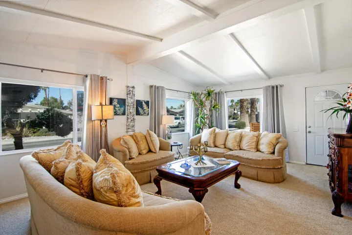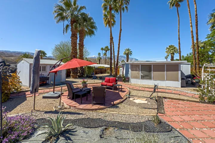 Welcome to 301 Avenida Andorra within the gates of 55+ Community Date Palm Country Club! Club amenities are 18 hole golf, tennis, 3 swimming pools, pickleball, a restaurant, social activities, 2 dog parks. Community has private RV storage available, security, clubhouse & pro shop! This property is a MUST SEE HOME + CASITA presenting ample opportunity for additional rental income! Offered Turnkey ready. Approximately 1600sqft home to the Approx 900sqft roomy guest house, This property includes a super sized lot with sunroom and large outdoor living space, there is more than enough perks to call this your next home! Beautifully cared for mobile home The main home offers spacious 2 bedrooms 2 bathrooms, a sunny living & dining room! If that’s not enough you can lounge is the cozy triple wide family room! Take a stroll around back to a fully attached guest house that offers a bedroom, living area, walk in closet and large bathroom. When sitting in the backyard enjoying the garden you have a close up view of the magnificent west facing mountains and blue sky! The yard is so lovely any visitors or grandkids have plenty of room to spend time outside and enjoy the scenery, not to mention the two lovely storage sheds. This 1976 Lancer has had numerous upgrades over the years, Polyurethane roof, Jacks were recently updated, dual pane windows. Main home has central air, plus additional mini split in the living room.