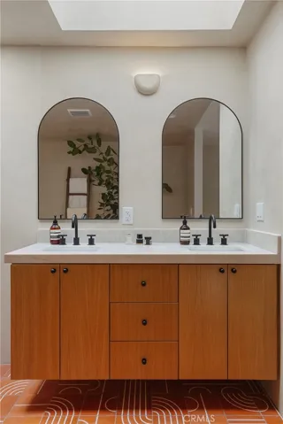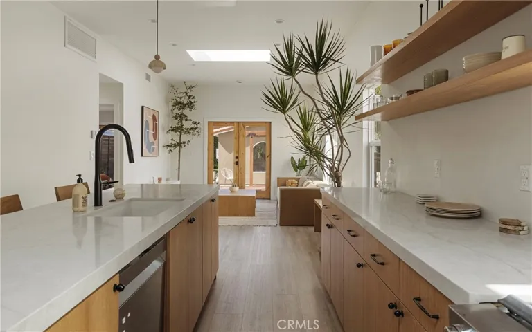 The main house offers three bedrooms, two bathrooms, and a dedicated office, thoughtfully designed to balance comfort, style, and flow. Skylights and high ceilings fill the interior with natural light, while the open-concept kitchen—with its long center island and custom white oak cabinetry—serves as the inviting heart of the home. A terracotta clay office provides the perfect retreat for creativity or focus.