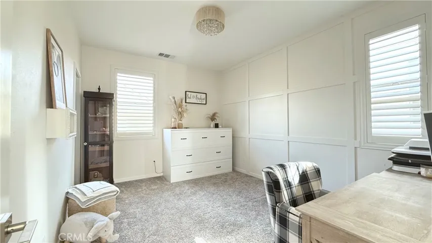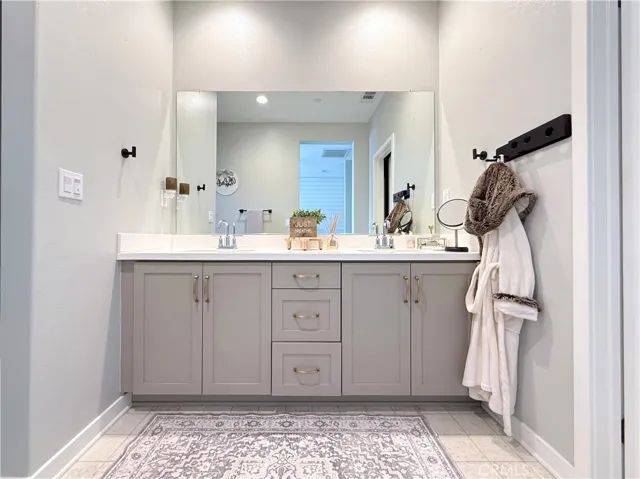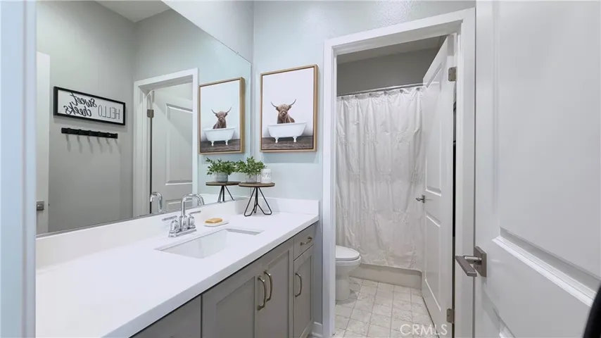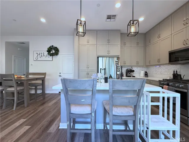 Welcome to your new home sweet home! Discover this bright and modern two-story home in the heart of the lively Bedford Community. The open-concept main floor is perfect for entertaining, with a gorgeous spacious kitchen that flows out to a sunny private patio featuring a paved section, turf, and an outdoor tv. The kitchen boasts tasteful features with a hexagon marble backsplash complimented with warm soft grey cabinets and uppers for additional storage and a brand new garbage disposal. The vinyl wood floors continue throughout the lower level, up the naturally lit stairwell accented with a custom mosaic pattern, and into the upstairs hallway and laundry room. Across from the hallway storage area, a full bathroom sits between two bedrooms— one of which features a small private balcony. The primary bedroom is inviting and spacious, complete with a cozy side nook, and a farmhouse style sliding barn door that leads to the en-suite bathroom. A double sided mirror door opens into the walk-in closet with custom built in shelving. The walk-in shower and private commode area complete the space. The two-car garage is wired and ready for EV charging installation. Residents enjoy access to Bedford’s resort-style amenities— two clubhouses, pools, fitness centers, and charming community BBQ areas. Fall in love with the variety of options available for dining, shopping, hiking, biking, and having hot spots nearby like the Shops at Dos Lagos, Eagle Glen Golf Club, and Amazon Fresh. Come see why Bedford feels like home!