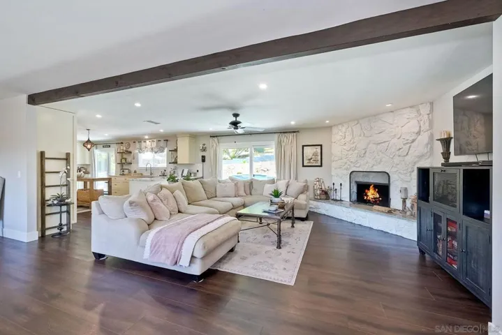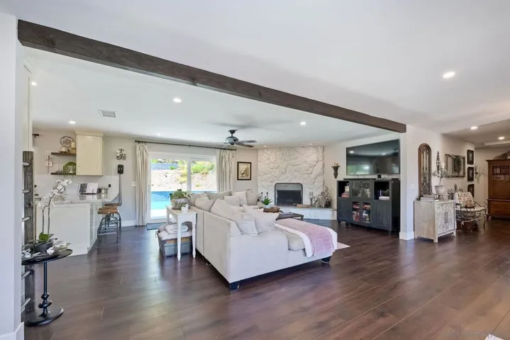 Fresh Pricing! A stunning freshly renovated single level estate set in desirable southwest Escondido, thoughtfully updated with panoramic views. Set in highly desirable southwest Escondido. This gorgeous home is well appointed starting with the interior open floorplan adorned in tasteful high quality engineered wood flooring, new custom light led fixtures and pendant lighting, a new gourmet kitchen fit for an executive chef, desirable Thermador appliances including a built in refrigerator, dual ovens, induction cooktop, custom finished hood/vent, microwave drawer, and custom cabinetry with soft close and dovetail drawers. Featuring 4 bedrooms, the primary suite hosts a new glamorous bathroom with new dual vanity, sitting make up quartz counter, with custom shower enclosure. The secondary bedrooms feature generous room sizes, a secondary bathroom features custom tile flooring, new counters, sinks and light fixtures. A very convenient half bath with custom closet organizers serves the interior guest and outdoor entertaining space. The backyard space with a newly constructed pool and spa, with new decking, a pool house/ADU/casita provide additional changing and retreat space. Fruit and Citrus trees throughout, a freshly paved circular driveway with room for RV parking and guest parking, a newly installed septic system, upgraded electrical panel and solar system. Set on a .69 acre lot, there is no HOA or Mello Roos. A family compound. For those seeking privacy and a family compound. Fresh exterior paint. Home Upgrades 1. All Newer Electric 2. Newer Roof 3. Upgraded insulation in the attic for prevention of rodents 4. Newer traffic rated commercial grade septic system 5. Newer custom-built kitchen and bathroom cabinets 6. Upgraded appliances (Thermador) 7. Custom hood vent 8. All newer walls 9. Paint on interior and exterior 10. Removed family room wall 11. All newer flooring 12. All newer lighting 13. Ceiling fans throughout 14. Custom California closets in all rooms and hallway closet 15. Recently had dryer vents and chimney inspected (Annual inspection) 16. Pool and Spa 17. Concrete in backyard 18. Garage drywall 19. Landscaping 20. Unpermitted ADU 21. All newer asphalt, circular driveways and down the shared street. 22. Custom countertops 23. Upgraded electrical panel (Approved by SDG&E) 24. Raised living room floors 25. Newer bathroom showers, toilets 26. Newer Sliders, French doors, doors, knobs and installation 27. Front door 28. New Solar System 29. Alarm System with Front Yard Camera 30. Replacement of 3 windows and an additional window in master bath 31. Christmas light outlets at roofline Room for RV, Boat, 5th wheel. Family Compound