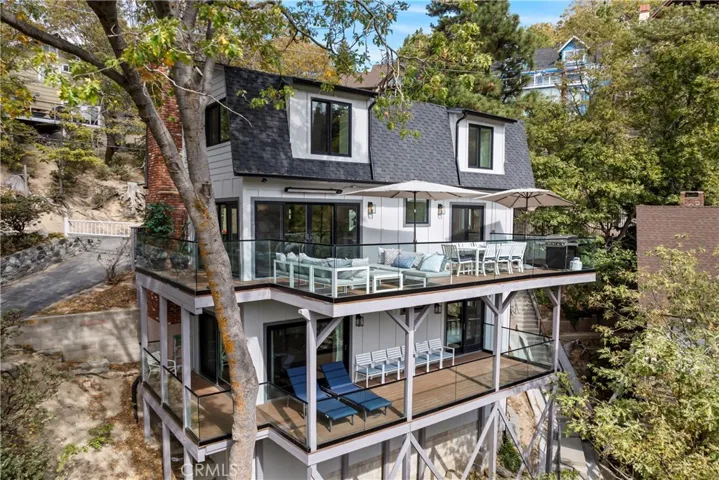 Just Listed Lakefront Opportunity of the Season! This LEVEL entry lake home is completely remodeled head to toe with Beautiful lake views straight to village. Enjoy the firework show right from your own deck. The photos do not do the views justice and will only get broader as the tress drop leaves. This property is completely set up for turn key occupancy with designer Crate and Barrel furnishings and accents intact. Short term rentals could be an amazing income source right from the start. All the rooms have a view! Light and bright with a great floor plan. There are three bedrooms up with an ensuite primary and an additional guest bath at lower level there is another ensuite bedroom with a spaciously sized family/game room and big screen TV. New trex decking on both levels with new patio furnishings, all new paint, flooring, cabinetry, and new systems! This truly is your opportunity for a turnkey experience! The half double dock is available for additional in deep water and is accessed on easy to walk concrete staircase down to shoreline.