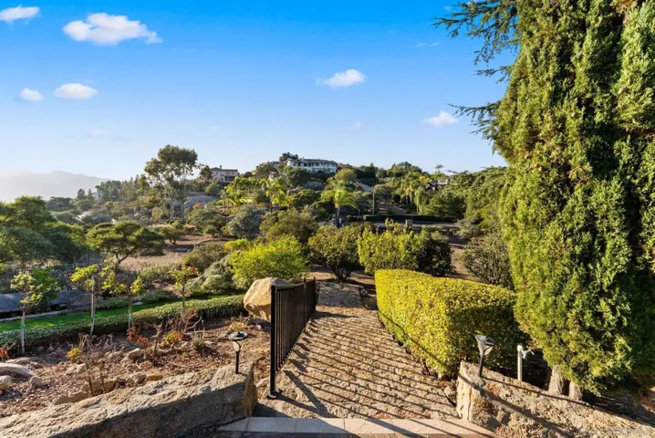 Exclusive gated community of Rimrock Estates, within Hidden Meadows Estates community, this beautiful mountaintop home offers panoramic ocean and sunset views on 2.7 private acres. Gorgeous custom wrought-iron entry door to an airy, open floor plan filled with natural light and porcelain tile floors. Kitchen features a large granite island, bar seating, and custom cabinetry—flowing seamlessly into the dining area with coffered ceiling and wainscoting. The spacious family room, framed by three 8-foot sliders, opens to a 2,000 sq. ft. wraparound patio—perfect for entertaining against endless views. The primary suite offers a tranquil retreat with ocean-view seating area, walk-in closet, and a newly remodeled spa bath with soaking tub and multi-head shower. Upstairs, two bedrooms and a private deck offer versatile living options. Outdoors, enjoy four sitting areas, a jacuzzi under the stars, dual grilling stations, and lush, water-wise landscaping with succulents, turf, and fruit trees. Pleanty of room for ADU. Fully paid solar and dual Tesla Powerwalls that completely offset nearly all monthly bills. The oversized 3-car garage with epoxy floors and built-ins completes this exceptional property. Experience the peace, privacy, and breathtaking beauty of mountaintop living. Close proximity to I-15, dining, shopping, and minutes to the Boulders Oak Golf Club. A Sanctuary in the Sky – Welcome to Rimrock Estates, a gated mountaintop community where luxury meets serenity and the horizon stretches endlessly before you. 2.7 acre property perched at 1,750 feet above sea level, this reimagined estate invites you to live life elevated—literally and figuratively. From the moment you pass through the handcrafted wrought-iron entry, you’ll feel the sense of arrival. Natural light pours through expansive glass doors, guiding you into a bright, open floor plan designed for seamless flow and breathtaking views from every angle. The heart of the home is a chef-inspired kitchen, anchored by a generous island and surrounded by gleaming granite, custom cabinetry, and bar seating that encourages conversation. The adjoining living and family rooms open effortlessly to a 2,000 sq. ft. wraparound terrace, where the ocean sparkles in the distance and the sunsets steal the show every evening. The primary suite is a retreat of its own—complete with a cozy sitting area, walk-in closet, and a newly remodeled spa bath with a soaking tub and multi-head shower designed for pure indulgence. Upstairs, two additional bedrooms (one currently used as an office) and a private deck offer flexible spaces for family, guests, or creativity. Outdoors, every detail is curated for California living. Enjoy four intimate sitting areas, a jacuzzi under the stars, two built-in grilling stations, and a garden filled with fruit trees and succulents—all designed for effortless beauty and sustainability. The oversized 3-car garage with epoxy flooring and built-in storage adds practicality to perfection. Property is 2.7 acres with water-wise landscaped- 2 areas of artificial turf, succulents, proteas, fruit trees-Apple-1, Avocado-3, Lemon-1, Lime-1, Golden Nuggets-2, Orange-2, and Pear-2, Two Raised garden areas. Solar and Roof are only 2 years old. If you’ve been searching for a place that feels worlds away—yet close to everything—this mountaintop sanctuary is ready to welcome you home.
