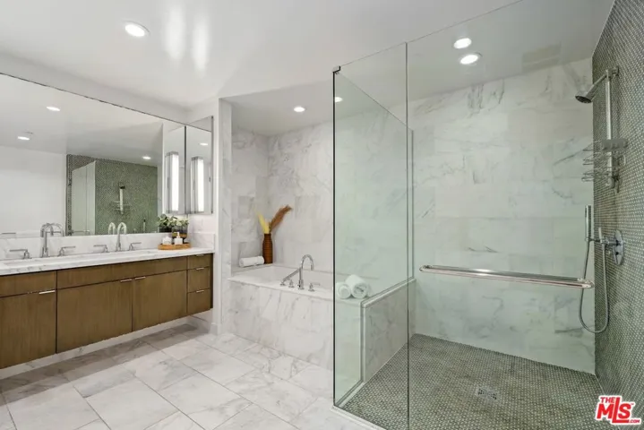 This beautifully designed one-bedroom, two-bath home features an open floor plan with floor-to-ceiling windows framing serene views of Tongva Park and filling the space with natural light. The chef’s kitchen showcases Thermador stainless steel appliances, Sea Pearl quartzite countertops, and custom oak cabinetry, seamlessly connecting to the spacious living and dining areas that open to a private park-facing terrace. The primary suite offers peaceful park views, ocean breezes, a walk-in closet, and a spa-inspired bathroom with dual vanities, soaking tub, and glass-enclosed shower. Additional highlights include hardwood floors throughout, in-unit washer and dryer, two side-by-side parking spaces, and a private storage unit.Residents enjoy five-star amenities including a 24-hour concierge, state-of-the-art fitness center, and exclusive access to the Skybridge Lounge with a full kitchen, fireplace, BBQ, and sweeping ocean views. There’s also a convenient pet spa and shower area perfect for rinsing off after a day at the beach. Perfectly located moments from Santa Monica Beach, The Pier, 3rd Street Promenade, and world-class dining, this residence defines modern coastal living at its finest.