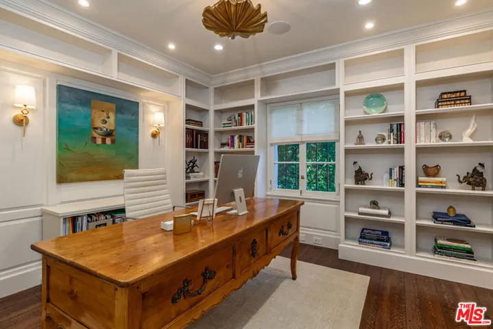 Located on prestigious Comstock Avenue in exclusive Little Holmby, this exquisite Spanish estate offers 4 bedrooms, 4 bathrooms and 2 powder rooms. Thoughtfully reimagined for modern living while preserving its architectural character, the residence celebrates timeless details with exposed wood-beamed ceilings, soft arches, wrought-iron accents and the warmth of natural materials like Saltillo tiling, wood and stone. A soaring two-story foyer with a dramatic staircase and artisan ironwork set the stage. Throughout, original elements meet elevated updates: hand-hewn beams, marble finishes and sunlit rooms. The main level features a versatile office with custom built-ins and a charming den/study with a corner fireplace. The pristine eat-in kitchen is anchored by terracotta tile floors, Calacatta marble countertops, generous storage and an adjoining breakfast room. The well-appointed, generous formal dining room, designed for entertaining, connects seamlessly to the terrace and pool through French doors, while the formal living room, framed by a grand fireplace and exposed wood beams exude sophistication. The spacious family room with soaring ceilings, Juliet balconies and dual sets of French doors creates effortless indoor-outdoor flow to expansive terraces for dining, lounging and entertaining. Upstairs, the ambient light-filled primary suite serves as a sanctuary with Juliet balconies, a fireplace, a secure custom walk-in closet with additional custom built-ins and a marble-clad bathroom featuring a soaking tub, standing shower and dual vanities. French doors open to an expansive terrace overlooking the lushly landscaped grounds. Two additional bedrooms complete the upper level, one with Juliet balconies, the other a junior suite with terrace access and bespoke storage.The lower level reveals a private guest bedroom suite with its own entrance, along with a laundry room, abundant storage, a two-car garage and a private gym with separate exterior entrance.Outdoors, towering hedges and mature trees, envelope the verdant grounds in privacy. Blooming flowers frame the sparkling swimming pool and spa, while a covered cabana with powder room, built-in barbecue and multiple alfresco dining and lounge spaces create a resort-like setting. With thoughtful modern amenities and effortless proximity to UCLA, Westwood Village, Beverly Hills, and Century City, this residence presents a rare opportunity to experience the beauty, privacy and prestige of Little Holmby living.