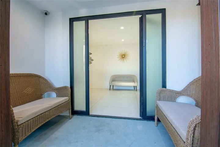 Step inside to discover an open-concept floor plan filled with natural light, featuring a spacious living area, dining space, and a **chef’s kitchen** with top-of-the-line stainless-steel appliances, including a 36″ Monogram refrigerator and 48″ Front range oven with 8 burners. Elegant finishes, premium flooring, and plantation-style sliding glass doors create a seamless indoor/outdoor flow.