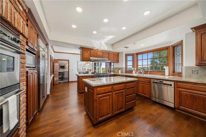 The chef’s kitchen is a dream for those who love to cook and entertain, featuring dual Viking ovens, a six-burner Viking range, Sub-Zero refrigerator/freezer, an expansive island, and abundant cabinetry, combining practicality with enduring style.