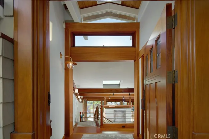 Designed by renowned architect Horst Noppenberger, this breathtaking approx. 3,665-square-foot coastal residence blends warm wood and glass elements with inspired modern design to capture panoramic ocean views and effortless indoor/outdoor living. Spanning three levels, the home welcomes you from the street-level entry with a light-filled foyer featuring clerestory windows, skylights, and custom woodwork, along with interior access to a two-car garage and four additional uncovered parking spaces.