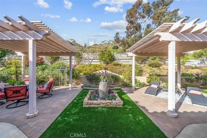 Outdoors, enjoy covered patios under dual backyard awnings overlooking a fenced riding arena, two-stall barn, feed room, and direct trail access. Surrounded by mature landscaping and white rail fencing, this peaceful equestrian retreat offers both privacy and practicality.