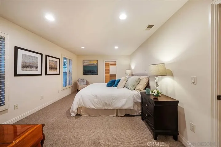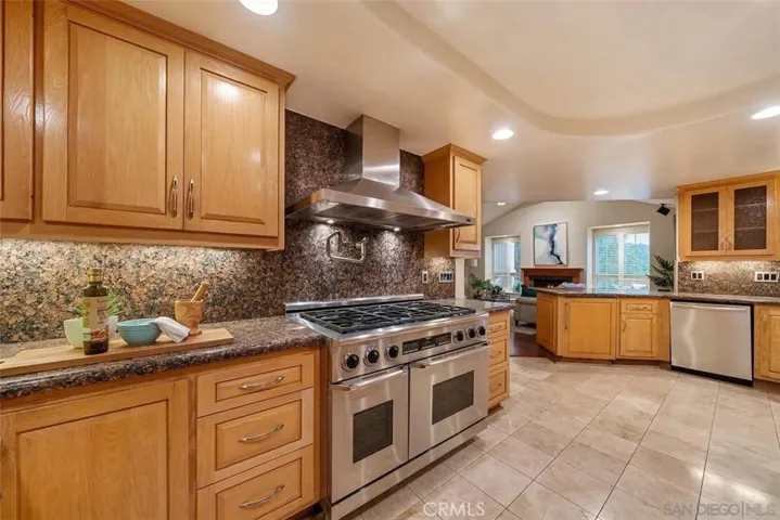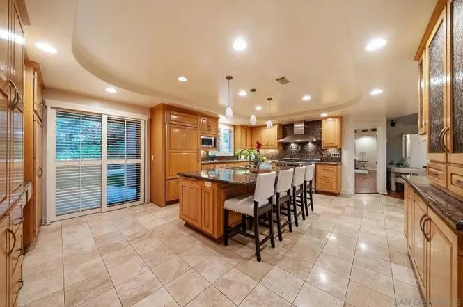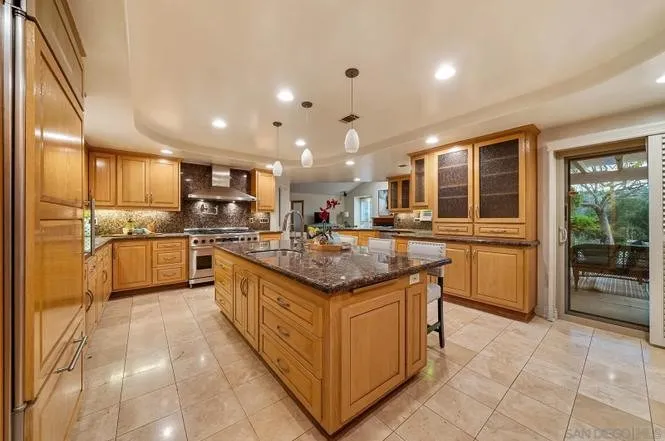 The kitchen is beautifully designed with granite countertops, a broad center island with bar seating, stainless steel appliances, built-in Sub-Zero refrigerator, gas cooking, and under-cabinet lighting. Its seamless flow into the dining and living areas makes it perfect for everyday living and entertaining.