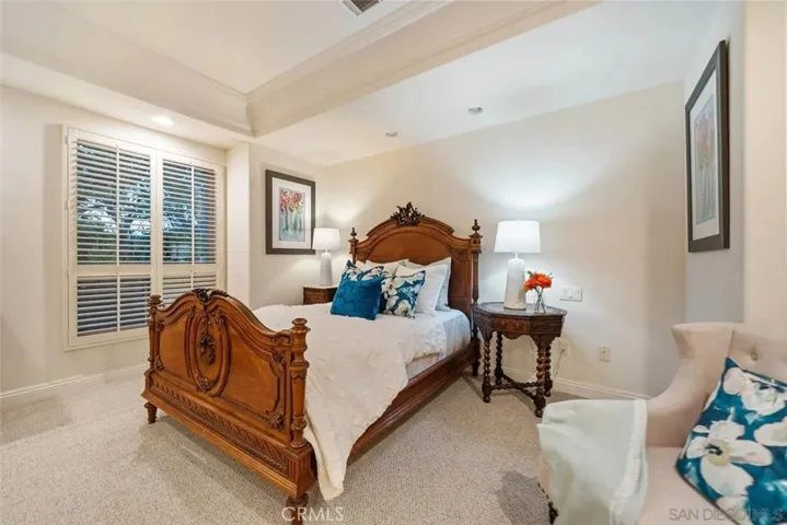 The main-level primary suite offers a private sitting area, tray ceilings, a walk-in closet, and a luxurious ensuite bath with dual vanities, soaking tub, and walk-in shower. A second bedroom is also conveniently located downstairs, while upstairs features another private suite, full bath, and a spacious bonus room with built-in shelving.