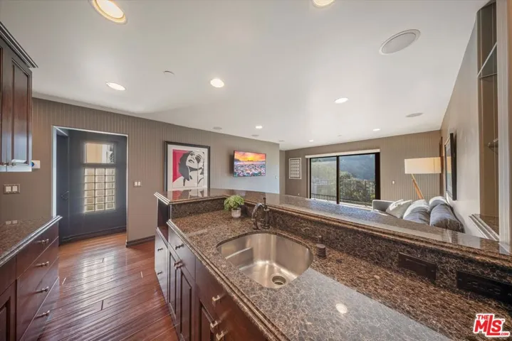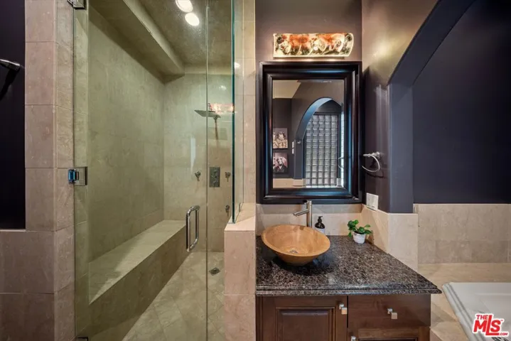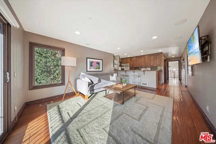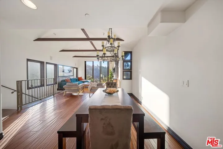 Tucked into the Cahuenga Pass near the Hollywood Bowl, The Ford, and Universal Studios, this striking Spanish Colonial Revival offers timeless character, modern comfort, and incredible versatility. Soaring ceilings and a dramatic chandelier welcome you into a bright open living and dining space framed by treetop and canyon views. The chef’s kitchen features professional-grade stainless steel appliances and connects seamlessly to the main entertaining level. Upstairs are two bedrooms and two bathrooms, including one with its own balcony and another that serves beautifully as a creative workspace, studio, or home office. Downstairs, a second living area features its own kitchen, a balcony overlooking the canyon, and a spacious primary suite with walk-in closet, dual vanities, a large walk-in shower with double shower heads, and a jetted soaking tub. The lower levels also include a dedicated media room with theater seating and a flexible bedroom currently used as a gym that opens to an outdoor patio with a built-in barbecue. Additional highlights include dual laundry areas, a Nest smart thermostat, Ring security system, a two-car garage with a 40v EV charger, and an extra parking space at the bottom of the property. Located just minutes from Studio City, Toluca Lake, and Hollywood with easy access to the 101, this multi-level home offers outstanding convenience and flexibility for creative living, extended stays, or guests.