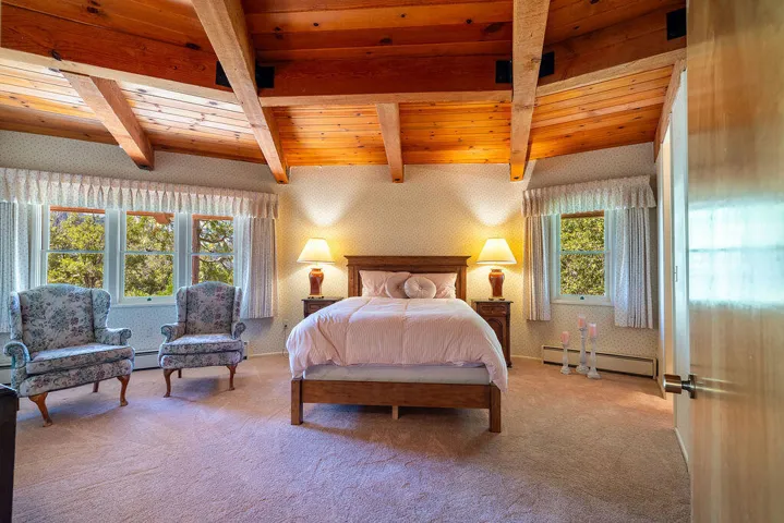 Discover mountain living at its finest in this custom luxury home in the gated community of Alpen Woods. With breathtaking panoramic views of Tahquitz Peak and Lily Rock, this one-of-a-kind property offers tranquility and inspiration. Its unique cylindrical design floods the home with natural light, complemented by vaulted ceilings, rustic woodwork, and a wraparound deck for stargazing or dining al fresco.Inside, four spacious bedrooms each have ensuite bathrooms for ultimate privacy. A cozy fireplace warms the great room, while a classic potbelly stove anchors the main floor, perfect for intimate gatherings. The loft, illuminated by skylights, offers versatile space for an office, hobbies, or extra sleeping quarters. Wine lovers will appreciate the wine cellar with a cozy card-playing nook.The gourmet kitchen boasts a commercial stove and ample pantry space, catering to both casual meals and culinary creations. Set on 1.26 acres, the property includes a seasonal creek and a deck for entertaining or relaxing in nature. With a three-car garage and abundant parking, this home blends luxury, comfort, and natural beauty
