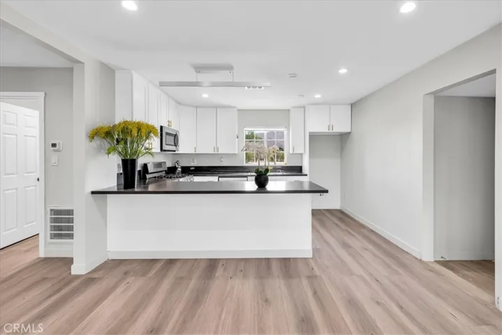 Step inside to discover new flooring, fresh interior paint, and recessed lighting that creates a bright, contemporary atmosphere. The upgraded kitchen is the heart of the home, featuring soft-close cabinetry, sleek quartz countertops, and ample space for cooking and entertaining.