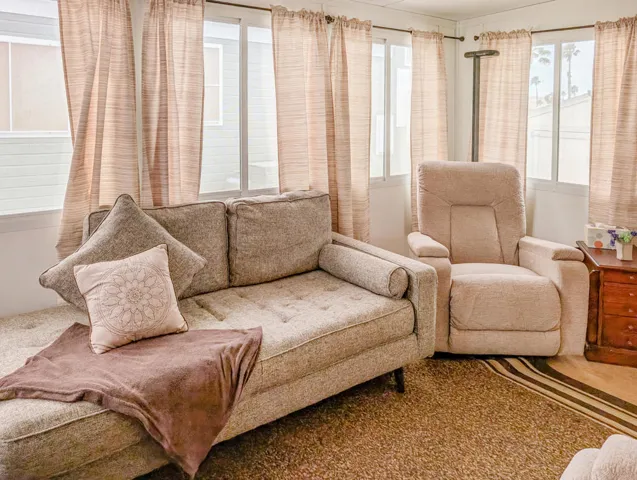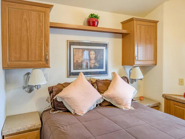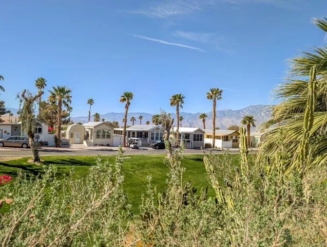Charming and serene! This 2007 Laurel Creek Park Model with ~550 sq. ft., 1 bedroom, 1 bathroom is delightful with modern touches and style throughout. Situated high above the 3rd hole of the golf course you’ll get a bird’s eye view of golfing activity and the stunning Mt. San Jacinto peaks while enjoying the covered protected deck. So much beautiful mature landscape to create a private and peaceful feeling, large shed for storage, side patio, paved parking and much more. Caliente Springs is a 55+ Resort with healing amenities of mineral hot spring pool and spas, 8-pickleball courts, tennis courts, laundry facilities, 9-hole golf course and a fun and active community with great schedule events. Lot is not owned, space rent is $811. Easy lender finance (OAC).