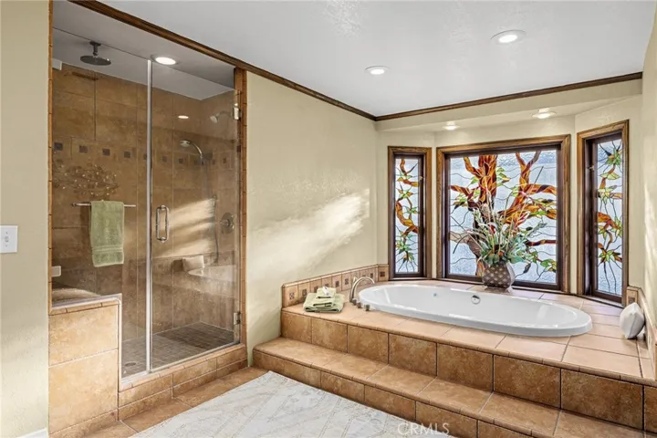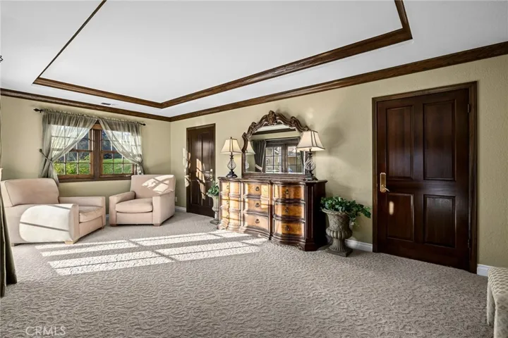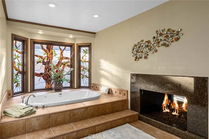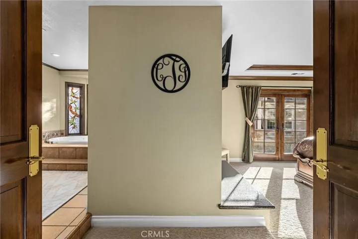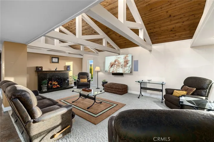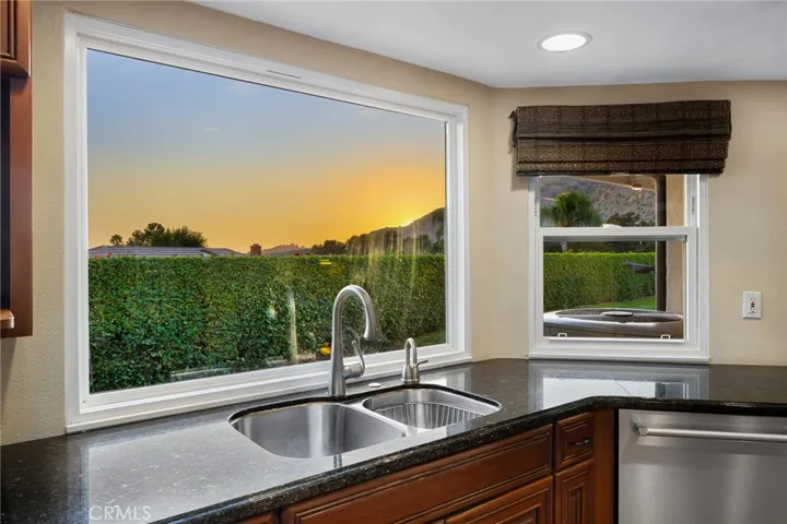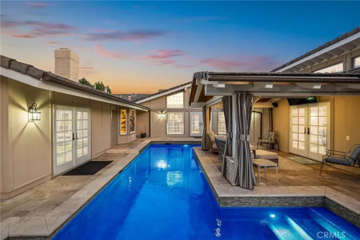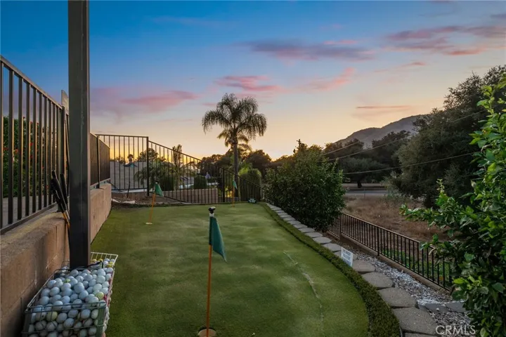 Custom California Ranch-Style Estate featuring a symmetrical façade, circular paver driveway, stacked-stone accents, and meticulous landscaping. Double iron-and-glass entry doors opens to a light-filled interior framed by floor-to-ceiling windows and wood-trimmed architectural columns, leading seamlessly into the formal living and dining rooms. The living room offers a tray ceiling with crown molding, a fireplace, and windows overlooking the front yard. The dining room offers a mirrored coffered ceiling and French doors that open to a front sitting area. The kitchen features custom wood cabinetry, granite countertops, stainless steel appliances, bar-top seating, and a breakfast nook with a built-in desk area. The adjacent family room offers a dramatic fireplace framed in granite, exposed white trusses, and wood-plank ceiling that blends architectural character. French doors and wood-framed, grid-style casement windows provide views and a seamless transition to the backyard. This wing also includes a bathroom with shower, a laundry room, and access to the three-car garage. On the opposite wing, an executive-style office showcases millwork, coffered ceilings, floor-to-ceiling built-ins, and richly stained cabinetry. The luxurious primary suite is a sanctuary–oversized and appointed with tray ceilings, dual sets of French doors, tall windows, and dual walk-in closets. The spa-inspired en suite bath features a jetted tub set beneath stained-glass windows, a walk-in shower, dual vanities with granite counters, and a double-sided fireplace shared with the bedroom. Additional bedrooms include one with an angled tongue-and-groove plank ceiling, and another with a tray ceiling. The hall bathroom features granite countertops, a frameless walk-in shower, and a jetted tub. The private, resort-style backyard is designed for elevated living–an expansive outdoor retreat ideal for entertaining or everyday luxury. A sleek PebbleTec pool is the centerpiece, paired with a stacked-stone spa, dramatic fire bowls, and cascading water features. A covered cabana lounge with vaulted wood ceiling, recessed lighting, heaters, and drapery offers a year-round outdoor living experience. A built-in BBQ island with stainless appliances, a fire table, sail shades, and paver decking sits beneath a majestic oak tree with views of hillside vistas. The detached three-car garage sits beyond a private gated driveway, where a putting green adds the final touch to this extraordinary estate.