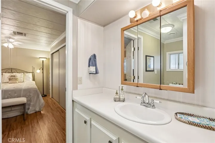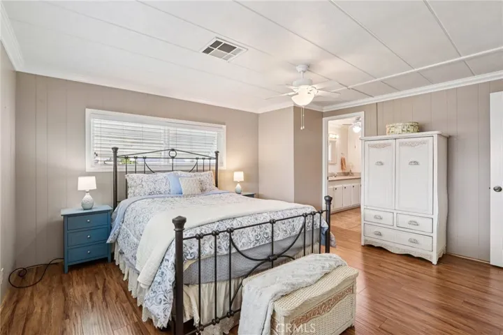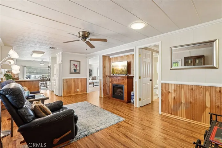 Welcome to 27601 Sun City Blvd #197, Located in the desirable Sun City Mobile Estates of Menifee. This spacious double-wide home features 1,440 sqft of living space with 2 bedrooms and 2 bathrooms, plus a connected sunroom and an aluminum wheelchair ramp for added convenience. Recent energy-efficient upgrades include dual-pane vinyl windows, window shades, a new AC unit, new roof and a water heater, ensuring comfort and savings year-round. Step inside to find new wood laminate flooring, designer carpet, and crown molding that add warmth and elegance. The living room is designed for entertaining, flowing seamlessly into the dining area and kitchen, where white cabinetry and butcher block-style countertops create a stylish contrast. An additional seating area offers a cozy spot to relax by the electric fireplace or enjoy a drink at the built-in bar. Down the hall, both bedrooms feature en-suite bathrooms for privacy and convenience. The master bedroom is a serene retreat with mirrored closet doors, a ceiling fan, and multiple windows that fill the space with natural light. Outside, enjoy ample covered parking, storage sheds, and a deck, perfect for soaking in the beautiful Southern California weather. This home is a must-see for those looking for comfort, and style. The 55+ community itself is vibrant and active, offering amenities such as a pool and spa, bingo, chair volleyball, card games, and holiday parties for residents to enjoy. Don’t miss out on the opportunity to make this house your home and be a part of a wonderful lifestyle that awaits you in this welcoming community.