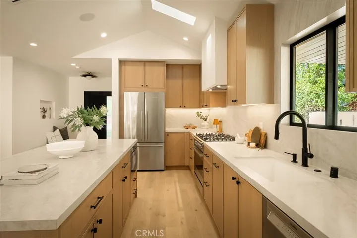 This beautifully reimagined home sits gracefully on a quiet street in one of Valley Village’s most desirable neighborhoods. Thoughtfully redesigned from top to bottom, the 3-bedroom, 2.5-bath residence showcases sophisticated design, natural light, and seamless flow throughout its open-concept layout. The inviting living room, anchored by a cozy fireplace, connects effortlessly to the dining area and a chef’s kitchen featuring a large island, custom White Oak cabinetry, Taj Mahal quartzite countertops, and premium appliances — the perfect setup for gatherings and everyday living. Sliding doors open to a spacious entertainer’s backyard featuring a brand-new pool and spa, surrounded by lush greenery and ambient landscape lighting that create a private, resort-like retreat. The primary suite offers direct access to the backyard and a spa-inspired bath with a freestanding soaking tub. Each bedroom is spacious and filled with natural light, offering comfort and versatility for family, guests, or creative use. The home also features a dedicated laundry room with ample storage, carport parking, and a detached 1-bedroom ADU showcasing high ceilings and abundant natural light.. The property’s extended driveway provides generous parking for several vehicles, including space for an RV. Set on an expansive 8,100 sq. ft. lot, this 2,600 sq. ft. property blends modern luxury with timeless warmth, offering exceptional design and functionality in one of Valley Village’s most desirable neighborhoods — just moments from a House of Worship.