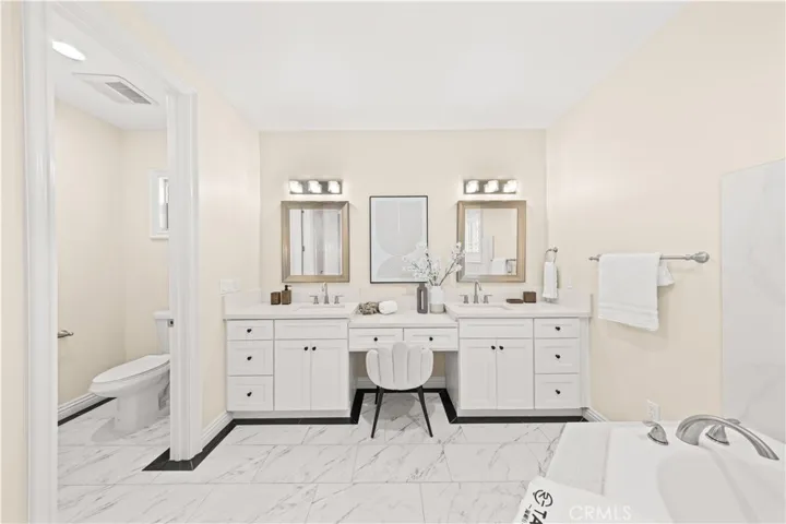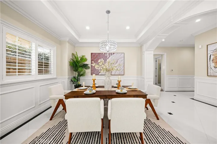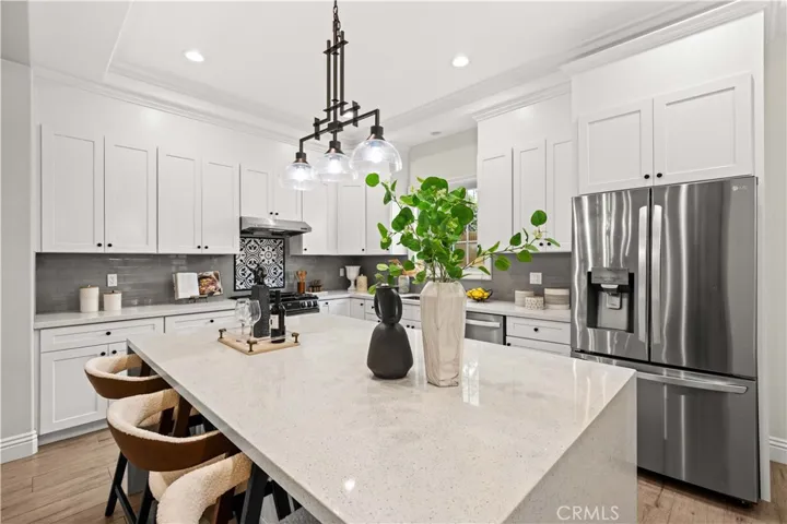 The formal dining room flows seamlessly into a light-filled open layout, leading to a gourmet chef’s kitchen adorned with a waterfall island, designer backsplash, and a separate prep kitchen—blending luxury with everyday functionality. Adjacent to the kitchen, the sun-drenched breakfast area overlooks the private backyard, offering a serene setting to enjoy the morning light with family. Opposite the breakfast area, the family room connects through sliding glass doors to the expansive yard, creating a perfect balance between indoor comfort and outdoor tranquility.