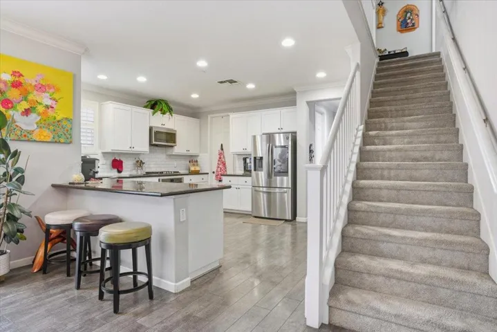 Welcome to this incredible 4-bedroom, 3-bath home offering 2,440 sqft of comfortable living space. This property blends spacious design with modern convenience! Enjoy a chefs kitchen featuring endless countertops, stainless steel appliances, and huge walk-in pantry! The open layout flows beautifully into a dining area and family room with high ceilings, perfect for entertaining or relaxing. Interior highlights include a downstairs bedroom and full bath, an oversized primary sanctuary with a grand walk-in closet, large upstairs loft, laundry room, and 2 separate garages. This home provides excellent education options including the highest rated public Elementary School in all of Gilroy. The nearby train station makes commuting simple and convenient. Outdoor enthusiasts will love the creekside setting and access to a popular walking and running trail along the levee and Christmas Hill Park. This community is also next to an exciting new development: an 80,000 sqft. complex currently under construction featuring two indoor ice rinks, a restaurant, snack bar, and pro shop. Move-in ready and meticulously maintained. Some of the beautiful furniture and high tech appliances to stay! Don’t miss your chance to make it yours!