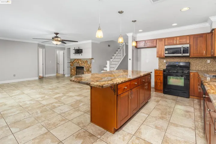 This beautifully maintained home blends timeless design with thoughtful upgrades throughout. The ground floor features elegant travertine tile flooring that enhances the home’s warm, inviting feel. The remodeled kitchen is a true showpiece with designer cabinetry, gorgeous granite counters with smooth beveled edges, a full mosaic-tile backsplash —perfect for cooking and entertaining. A fireplace with granite surround adds both elegance and comfort to the living area. The flexible floor plan includes five bedrooms, with a full bed and bath downstairs ideal for guests or multigenerational living, plus a bonus room and private office/den offering space for work or play. Step outside to your private tropical retreat featuring lush palms, a free-form sparkling pool, and a spacious lawn for relaxation and play. Enjoy an expansive covered patio with raised color stamped-concrete and cooling ceiling fans—a perfect setting for gatherings, dining, or simply unwinding outdoors all year long. Paid-off solar keeps energy costs low, even with the A/C and pool running. Located in one of Discovery Bay’s most desirable neighborhoods, close to parks, shopping, and recreation—this home is move-in ready and truly a must-see!