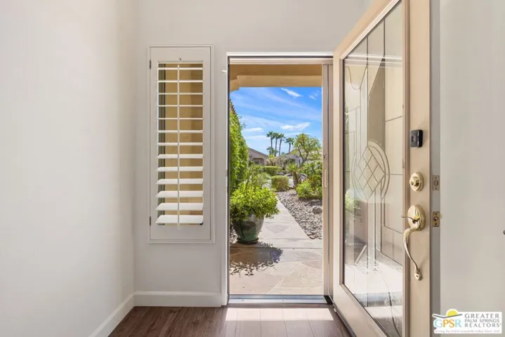 Move-in Ready! Freshly painted! Sought-after Pasadena model at Sun City Palm Desert offers 2 bedrooms and 2 baths in a bright, open-concept layout designed for easy living. Attractive curb appeal, low-maintenance landscaping, and a peaceful location on a quiet street that ends in a cul-de-sac (without being on it) make this home especially appealing. You’ll also love the convenient proximity to the owners-only gate for easy access to Starbucks and grocery shopping – everyday life made simple. Ask about the nearby “secret” golf cart gate! Recent updates include fresh interior paint and slab granite countertops in the kitchen and baths. The kitchen features a reverse-osmosis water filter, stainless steel appliances, and a charming breakfast nook framed by a bay window and slider to the patio. Solid vinyl plank flooring flows through the main areas and bedrooms, complemented by plantation shutters and a custom glass front door. The Primary Suite offers a custom-fitted closet with upgraded cabinetry including built-ins, drawers, and shelving. The Guest Bedroom, located across from the second bath, includes a convenient Murphy bed. The finished 2-car garage features epoxy flooring, cabinetry, utility sink, and shelving for extra storage. Exterior highlights include a Restora overlay on the walkway and driveway. Enjoy a north-facing backyard with desert-wise landscaping, established citrus trees, an Alumawood patio cover, and an extended concrete terrace perfect for entertaining. Sun City Palm Desert is a 55+ resort-style community named by Money Magazine as one of the “Eight Best Places to Retire in America.” Amenities include two 18-hole golf courses, an 18-hole putting course, multiple pools including exclusive use of a neighborhood pool, two fitness centers, tennis, pickleball, bocce, softball, dog parks, two restaurants, and more than 80 clubs and activities. Low HOA fees include cable and internet.