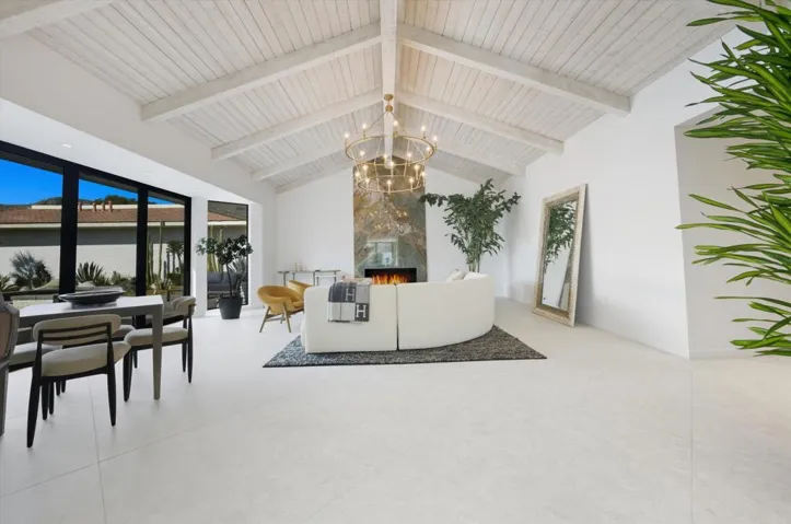 Welcome to this stunning home located in Morningside Country Club, Rancho Mirage, CA. Designed by an award-winning team of architects and interior specialists. This stand-alone residence sits on a large, quiet cul-de-sac lot with a serene lake backdrop. Enter thru the front gate to a redesigned pool and spa with cascading waterfall. A covered promenade leads to a striking 6 ft glass pivot door. Inside, natural light fills the home through floor to ceiling glass and multiple skylights. The Living area features a 16ft vaulted wood ceiling w exposed beams and a folding wall of glass that opens to a south facing pool and mountain views. The custom bar includes a dishwasher, Scotsman ice maker, Miele wine column and a quartzite waterfall counter. Porcelain flooring extends seamlessly to the outdoor dining area through another folding wall of glass ideal for al-fresco entertaining. A SONOS sound system enhances the atmosphere throughout the home. The Chef’s kitchen is equipped with Miele appliances, Wolfe induction cooktop, custom cabinetry and Cambria countertops, centered around a 15 ft island with seating for four. The primary suite includes two private patios, a sitting area, programmable Hunter Douglass blinds, dual walk-in closets, and a spa-like bath with lake and mountain views. Two additional ensuite bedrooms feature private patios and custom details. Additional features include a custom laundry room w Cambria counters and built-ins, owned solar power, a private putting green and a two-car plus golf cart garage. Experience refined desert living at Morningside Country Club.