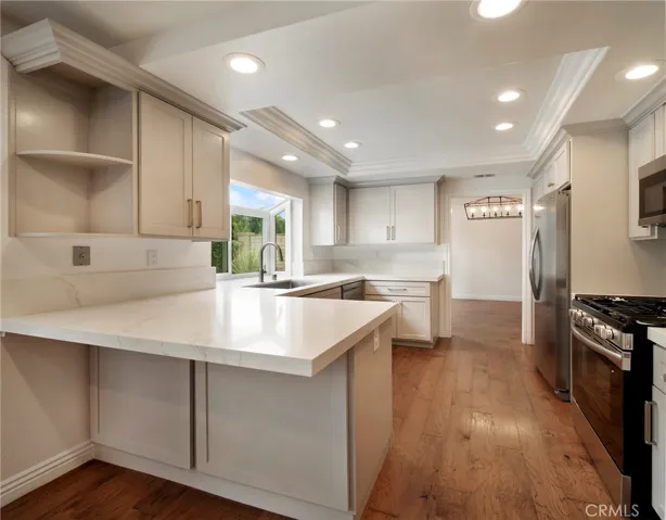 Pella windows and French doors, rich wood flooring, recessed lighting, and plantation shutters reflect quality craftsmanship throughout. A welcoming formal entry opens to an airy layout where anewly remodeled chef’s kitchen—with new quartz counters, new appliances, a charming garden window, plentiful cabinetry, and a counter bar—flows seamlessly into the living area highlighted by a fireplace and backyard views. Cathedral ceilings in the living and dining areas create a bright, open feel while dual-pane French doors invite the outdoors in.