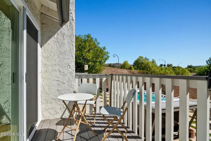 Tucked at the end of a cul-de-sac in Thousand Oaks, this beautifully remodeled 3-bedroom, 2-bath home blends modern comfort with timeless style. Set on a large, low-maintenance lot, it features owned solar with a Tesla battery for energy efficiency and peace of mind. The inviting kitchen showcases custom cabinetry, sleek stone countertops, stainless steel appliances, and a convenient breakfast bar that opens to the living area–perfect for entertaining. Warm hardwood flooring flows throughout, complemented by brand new ceiling fans, wall sconces, and light fixtures. The spacious living room offers a cozy fireplace and access to a balcony that extends the living space outdoors. The primary suite includes its own balcony retreat, a walk-in closet, and a stunning remodeled bath. Both bathrooms feature elegant tile showers, with the hall bath offering a tub/shower combo. Outside, the expansive yard is designed for relaxation and fun, complete with an above-ground swim spa and ample room to play, garden, or gather with friends. A rare find that combines style, efficiency, and privacy in a prime Thousand Oaks location.