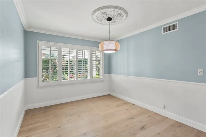 The formal living room features cathedral ceilings, crown molding, plantation shutters, and a brick fireplace with a stunning antique carved mantle. The elegant formal dining room showcases a picture window overlooking the fabulous backyard, complete with a pergola, professionally landscaped garden, and a private jacuzzi.
