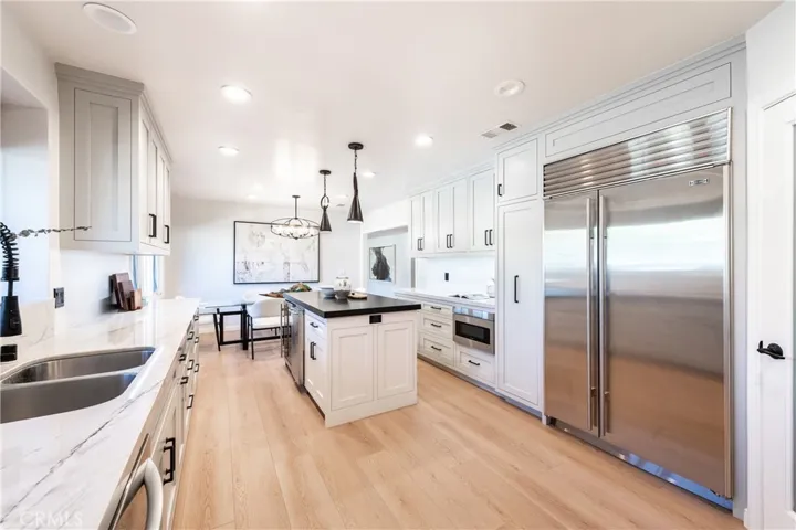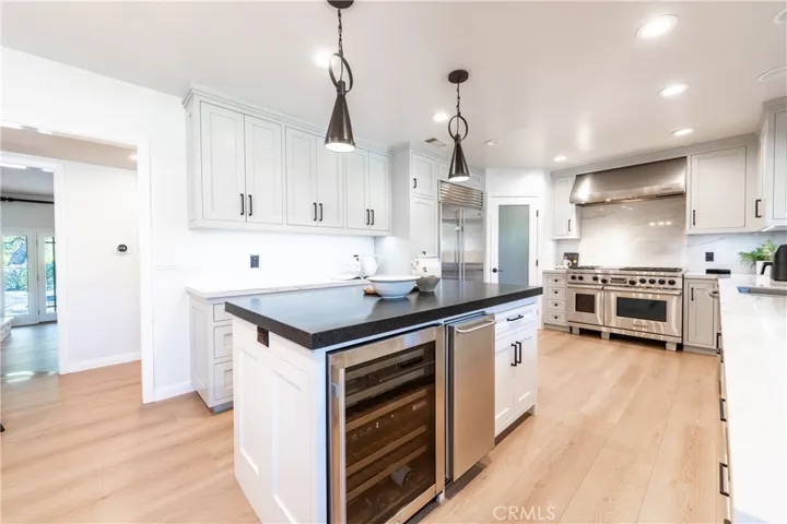Experience refined California living in this exquisite single-level estate, perfectly situated in the prestigious Encino Hills. A circular, paved driveway framed by lush, mature landscaping welcomes you to this private sanctuary that blends sophistication with modern comfort. Step inside and discover a bright, open floor plan designed for effortless living and entertaining. The foyer flows seamlessly into spacious living and dining areas, where white oak plank floors, recessed lighting, and designer finishes create an atmosphere of warmth and understated elegance. A dramatic step-down living room showcases a striking stack-stone fireplace and a custom built-in media wall, with French doors opening to the backyard oasis beyond. The gourmet kitchen is a showpiece, featuring a stone-clad center island with a built-in wine fridge and ice machine, stunning quartzite countertops and backsplash, and custom soft-close cabinetry. Top-of-the-line stainless steel appliances — including a Wolf six-burner range with double ovens, and a Subzero refrigerator — make this a true chef’s dream. A walk-in pantry and sunlit breakfast area with views complete the space. The luxurious primary suite offers a tranquil retreat with vaulted ceilings, an expansive wall of glass, and direct access to the backyard. The spa-inspired ensuite bath features a freestanding soaking tub, dual vanities, a makeup station, and a two-person rain shower with built-in seating. The massive custom walk-in closet is thoughtfully designed for both style and functionality. Three additional bedrooms offer versatility for family, guests, or a home office. Each room is beautifully appointed, featuring ceiling fans, custom finishes, and ample closet space. Step outside to your private resort-style backyard — a haven for relaxation and entertaining. Enjoy multiple conversation areas for gatherings and star gazing or take a dip in the sleek black-bottom pool and spa, or unwind by the fire pit on the elevated wooden deck. A meandering path leads to the peaceful lower-level picnic and bocce ball areas, all surrounded by nature, completing this stunning outdoor escape. This exceptional property embodies comfort, style, and sophistication — offering the ultimate in California living in one of the Valley’s most coveted enclaves. Located within the Lanai School District, close to shops, restaurants, and easy Westside access.