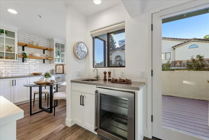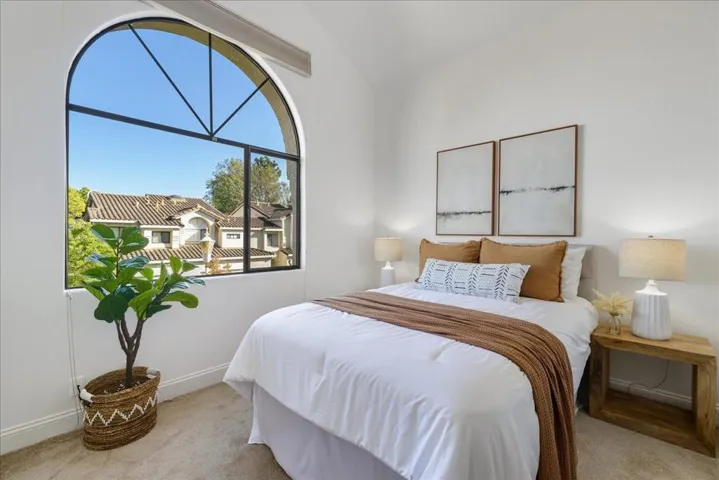 Welcome to this rarely available end-unit townhome nestled in the desirable San Carlos Hills! An elegant curved staircase with a custom banister creates a striking architectural focal point as you enter. The bright living room is filled with natural light and features soaring ceilings, a designer pendant light, a beautifully accented fireplace, and direct access to a private outdoor patio perfect for entertaining. The open gourmet kitchen boasts high-end stainless-steel appliances, abundant cabinetry, a quartz-topped island, designer tile backsplash, and a wet bar. A sunlit breakfast nook with picture windows and built-in bench seating offers the ideal spot for casual dining or morning coffee. Upstairs, the oversized primary suite impresses with vaulted ceilings, a double side fireplace, walk-in closet, dual vanities, a spacious glass-enclosed shower, and a jet soaking tub. Two additional bedrooms and a hall bath complete the ideal family layout. The versatile downstairs den is perfect for a home office, playroom, or optional fourth bedroom. Side-by-side 2-car garage, Central A/C included. Enjoy nearby parks and hiking trails, and a short drive to downtown San Carlos with its vibrant restaurants and shopping. Dont miss this exceptional home!