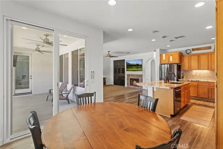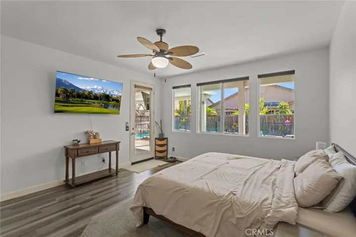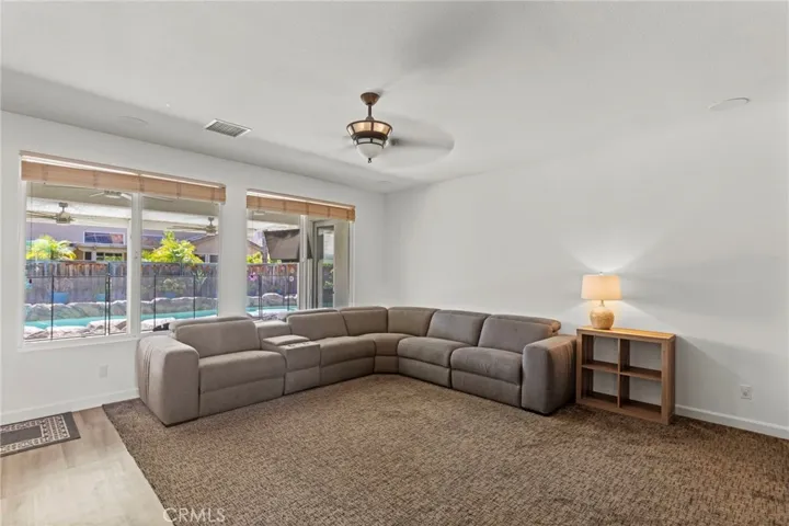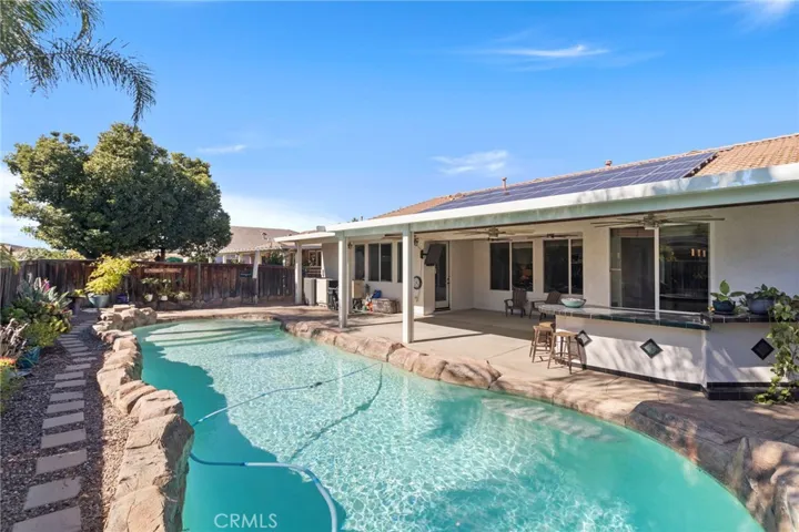 Beautiful Single Story Pool Home nestled on a quiet street in the Menifee Valley Ranch neighborhood. There are so many wonderful features in this 4 bedroom home designed for entertaining and comfortable living with its spacious and open floor plan. Right away you will notice the drought friendly landscape with your own personal 3-hole putting green on grass turf. The living room and dining room have high ceilings letting in abundance of natural light. In the chef’s kitchen opening up to the family room, you have granite countertops, touchless faucet, large kitchen island with large basin sink, and plenty of storage. Family room offers cozy fireplace. In your private backyard oasis enjoy many features…the sparkling pool with waterfall and a Baja shelf to lounge in, BBQ island with firebowl, patio cover with ceiling fans and mounted tv. Large master bedroom has black out curtains and master bathroom with custom built spacious walk-in shower. Additional features are 3 car garage, leased solar, smart home thermostat, THX surround sound and more. This community is close to shops, restaurants, freeway, biking and hiking trails.