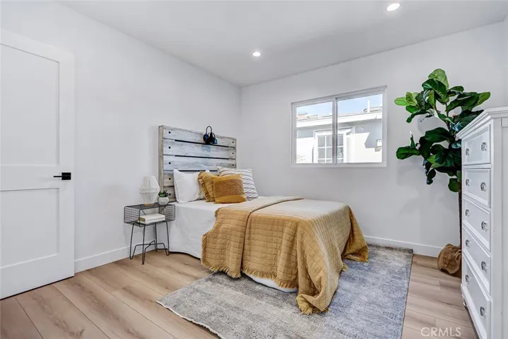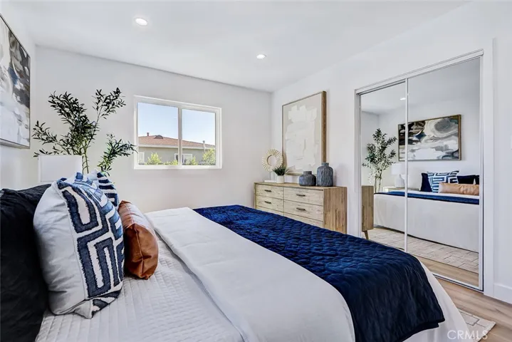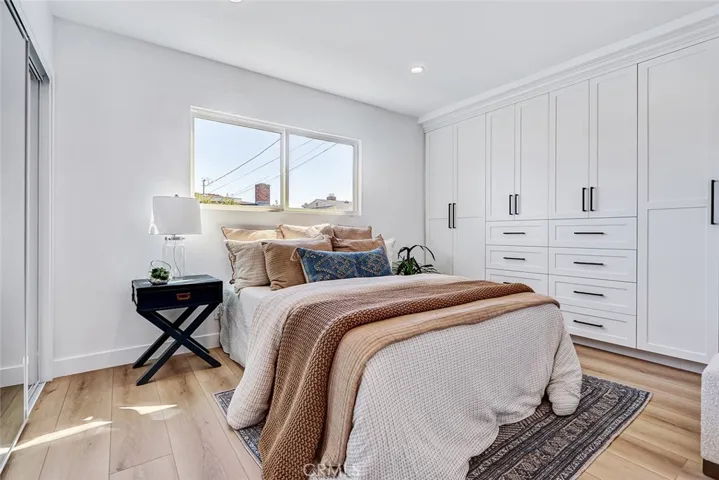 The primary suite is a private retreat, featuring a spa-inspired en suite bathroom with custom designer tile, elegant fixtures, and a luxurious tub/shower combination. Dual closets—including one with custom built-ins reminiscent of Beverly Hills estates—offer both style and functionality.
