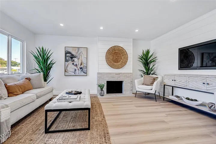 Step through the front door into a gracious formal living room that immediately sets the tone. Custom shiplap wood detailing graces the entry, living room, and a stunning fireplace that serves as the centerpiece of the space—perfect for hosting intimate gatherings or elegant soirées.