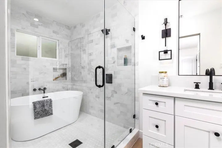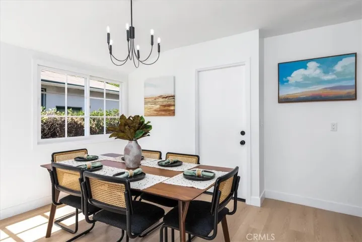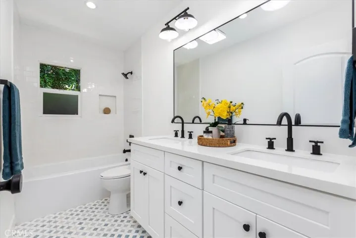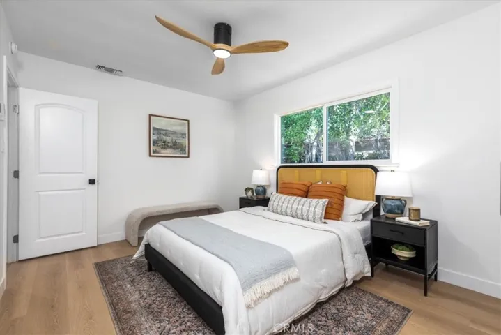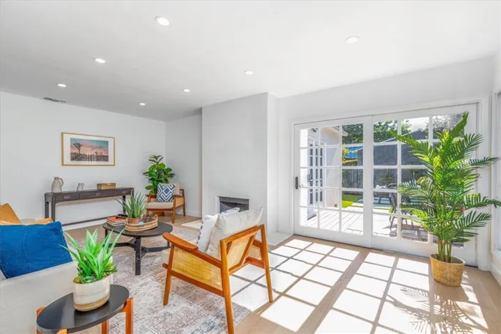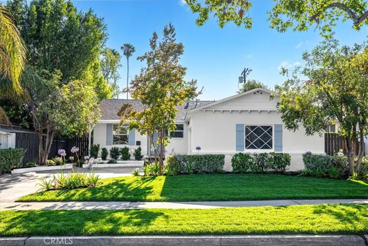 Tucked away on a charming, picturesque tree-lined street in a highly sought-after neighborhood of Sherman Oaks with award winning schools, this meticulously remodeled single-story home offers a perfect blend of modern elegance and serene living. From the moment you step through the front door, you’ll be captivated. The design seamlessly integrates a fully equipped kitchen into the bright and airy dining area, and living room accentuated by a tastefully designed floor to ceiling marble tile fireplace. The kitchen boasts top-of-the-line Stainless style appliances, quartz countertops with a breakfast bar, ample soft-closing cabinetry, and a large single basin sink adorned with a striking tile backsplash and floating shelves further enhance the kitchen’s appeal. The sliding door off the living room effortlessly merges indoor and outdoor living spaces. Luxurious vinyl wood floors and recessed lighting run throughout the home. The well-appointed primary bedroom features an en-suite bathroom with a free-standing soaking tub and walk-in shower, dual sink vanity and a built-in bench. One of the secondary bedrooms which could be used as an office or den has its own fireplace and elegant French doors that open onto an expansive deck. Step outside to discover a breathtaking backyard designed for both relaxation and entertainment. An oversized wood patio sets the stage for al-fresco dining and gatherings, complete with a fire pit, The property is enveloped in lush greenery, surrounded by mature trees, a spacious lawn area, and serene landscaping, all enhanced by a drip system and sprinklers. Additional features of this home include a new HVAC system with new ducting and a new water heater. The spacious 2-car garage is attached to the home with convenient access into the home. Conveniently located near the highly regarded Kester Elementary School which was recently designated a national Blue Ribbon School, this home also provides easy access to LA’s Westside, Beverly Hills, Sherman Oaks Galleria, the serene Japanese garden, boutique shopping, and an array of fine dining options along Ventura Boulevard.