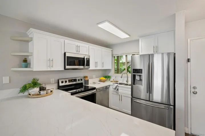 Complex is VA Approved! Step into a beautifully remodeled 2-bedroom, 1-bath condo that perfectly blends modern style with everyday comfort. Perched above the greens of Admiral baker Golf Club, this home offers panoramic golf course views from your living room and your private balcony—an ideal spot for morning coffee or evening relaxation. Inside, thoughtful upgrades elevate the living experience, including new flooring, custom kitchen cabinetry, elegant quartz countertops, and a sleek, spa-like bathroom featuring a Carrara-style tub and vanity. Located in the gated community of Valley meadows North, residents enjoy desirable amenities such as a spa, exercise room, and laundry facilities. Just minutes from SDSU, Mission Valley, shopping, restaurants, and San Diego’s iconic beaches, this property puts you right at the heart of it all.