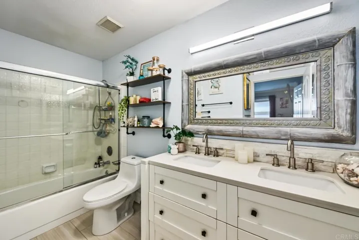 Welcome to this spacious and tastefully upgraded condo located in the charming community of Bonsall. This move-in-ready 2-bedroom, 2-bathroom home features a well-designed floor plan with one bedroom with private gated patio and a full bath on the main level and a generously sized upstairs suite with an en-suite bathroom. The kitchen boasts granite countertops, soft-close cabinetry, and sleek stainless steel appliances—perfect for cooking and entertaining. The inviting living room centers around a beautiful fireplace and is complemented by wood flooring and crown molding throughout. Additional high-end features include upgraded bathroom vanities, top-of-the-line Andersen windows, energy-saving solar, and a 1-car attached garage for added convenience. Enjoy your morning coffee on your gated front patio – ideal for relaxing. Located close to shops, dining, and with easy access to freeways, this condo offers the perfect blend of comfort, style, and practicality. Additionally the city broke ground on The San Luis Rey River Park. A master plan which will include two park sites. The Bonsall Park Plan includes: 2 basketball courts, 3 baseball fields, 2 tennis courts, 4 soccer fields, a tot lot playground, a youth playground, a bike course, a skate park, a dog park, picnic areas open space, shade structures, restrooms, miles of trails, and landscaped areas.