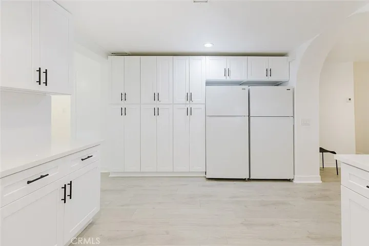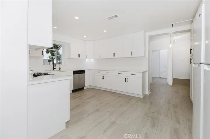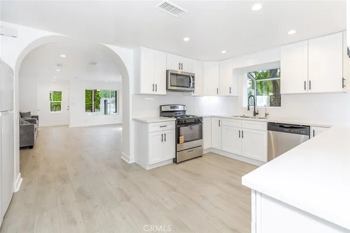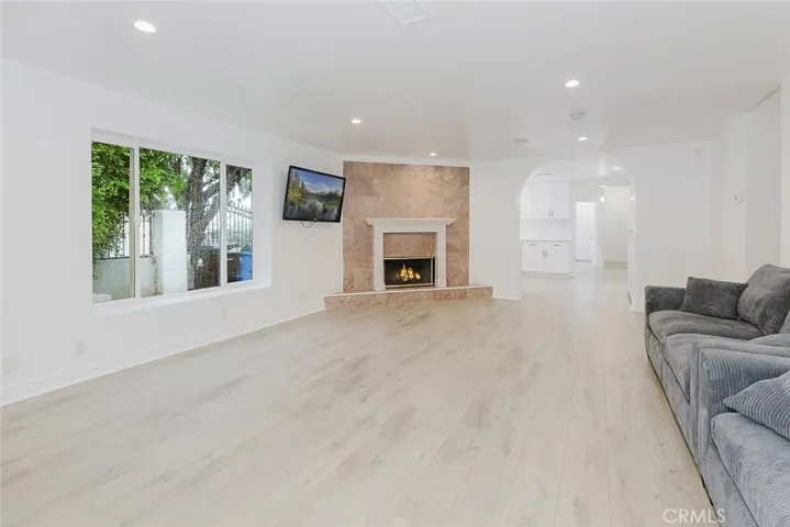 Once inside you’ll discover a fully renovated interior featuring new laminate flooring, a modern kitchen with quartz countertops, ample cabinetry, and brand-new stainless steel appliances, including a stove, dishwasher, microwave, two refrigerators, and a stackable washer/dryer, all included in the sale. The home has been freshly painted throughout and showcases an open-concept layout with spacious, light-filled rooms, recessed lighting, and a gas fireplace with a stylish tile backdrop.
