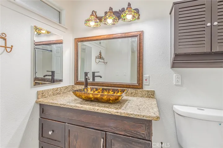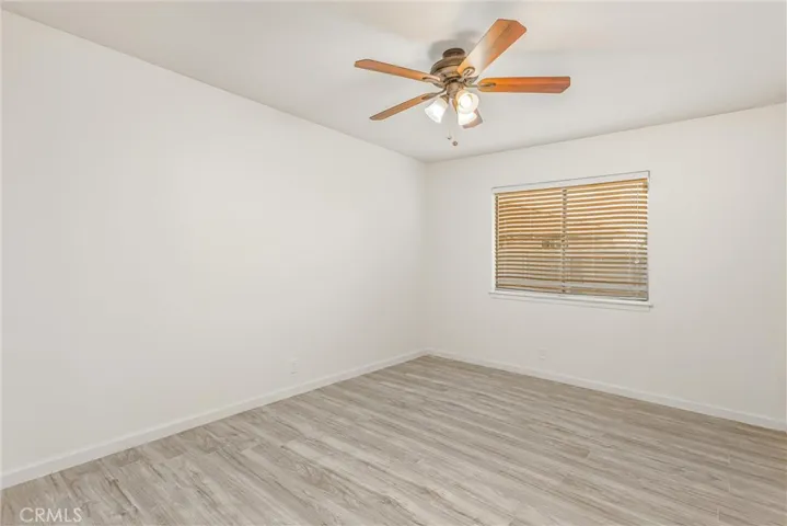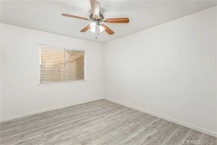 Recent upgrades include recessed lighting, neutral paint tones inside and out, and new laminate wood flooring throughout. Down the hall are three spacious bedrooms, each with laminate flooring and ceiling fans. The two secondary bedrooms share a full bath with a granite vanity with a decorative countertop sink, and shower/tub combo, while the primary suite offers its own ensuite bath with matching finishes.