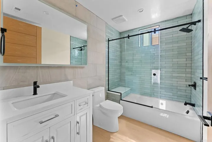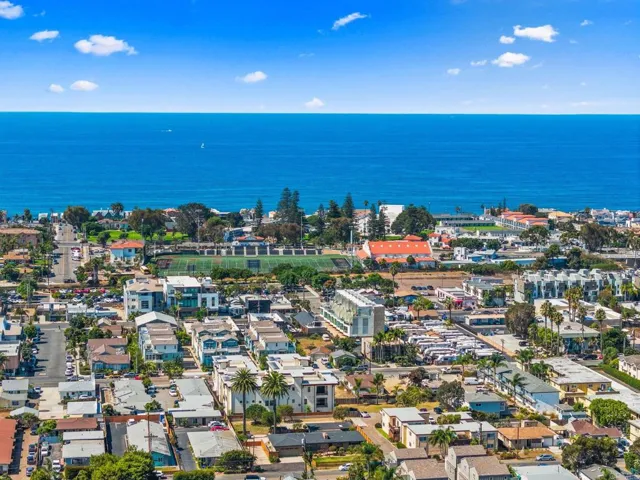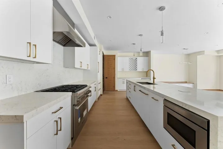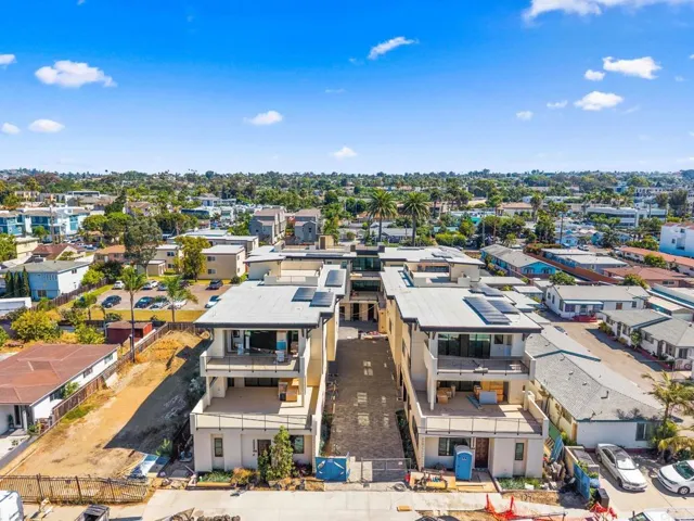 NEW CONSTRUCTION – Beautiful single-level (no stairs), first-floor unit at Roosevelt Nine Condos. Home features an open-concept true chef’s kitchen showcasing an oversized island, white custom European slab-style cabinets, Thermador appliances (fridge and dishwasher paneled to match), gold hardware, a Kohler touchless faucet, and a professional-grade Thermador hood vent. Corian Quartz counters, matching backsplash, and a dramatic waterfall island create a modern, high-end look. Dining area includes a large custom built-in seating bench with extra storage. Solid core doors from Urban Doors and matching wood baseboards run throughout, complemented by luxury motorized window treatments in bedrooms. Spacious primary suite offers a large sliding glass door opening to the private backyard and filling the room with natural light. Attached primary bathroom features designer tile, a custom glass shower enclosure, and a fully built-out walk-in closet. Located in the heart of Carlsbad Village, this home is a short stroll to countless dining options ranging from Michelin-rated restaurants like Jeune et Jolie and Lilo to casual favorites like Pure Taco and everything in between. The large, side-by-side attached garage (424 sf) will include epoxy flooring and custom storage cabinets, along with an EV outlet for car charging. Comes with owned solar. Unit is complete and power / gas are on. This an incredible opportunity to move into a highly upgraded brand-new home in one of Carlsbad’s most vibrant neighborhoods.