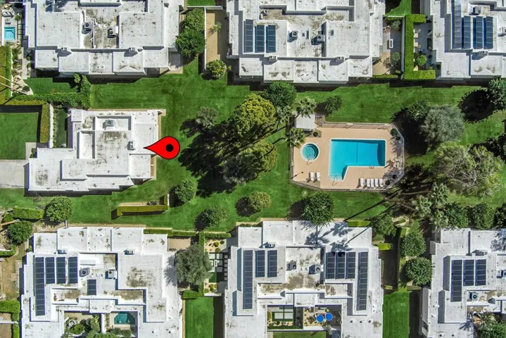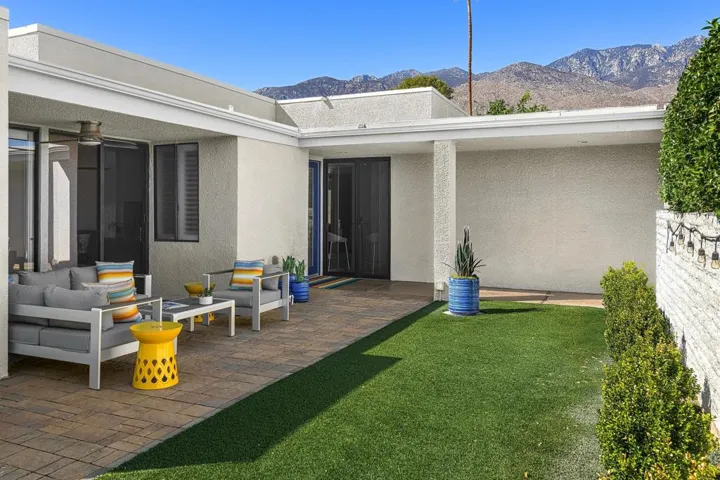 Spacious Stand-Alone Condominium in South Palm Springs. Located in the desirable Twin Palms neighborhood of South Palm Springs, this beautifully maintained home on fee land (you own it!) offers comfort, privacy, and a location just minutes from downtown, restaurants, and shopping.With 2 spacious bedrooms–each with an ensuite bath–a separate den, powder room for guests, and 2,181 square feet of well-planned living space, this home is designed for both everyday comfort and effortless entertaining. Soaring 11-foot ceilings create an airy, open feel, while the generous living room, formal dining area, and light-filled eat-in kitchen flow seamlessly together.Nearly every room opens to a series of private patios, offering peaceful outdoor areas perfect for relaxing or dining al fresco. Enjoy beautiful views of the lush community greenbelt and sparkling pool, while the gated front courtyard adds privacy and a warm welcome. An attached two-car garage with built-in storage provides added convenience.Whether you’re seeking a full-time residence or a seasonal retreat, this Twin Palms gem delivers style, space, and an ideal location to experience the best of Palm Springs living.