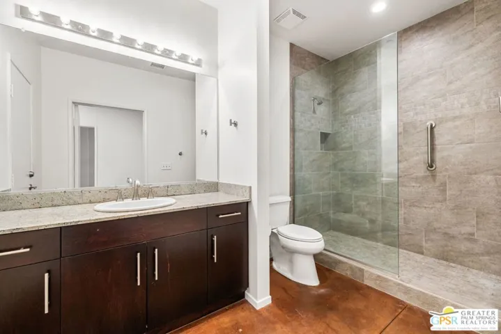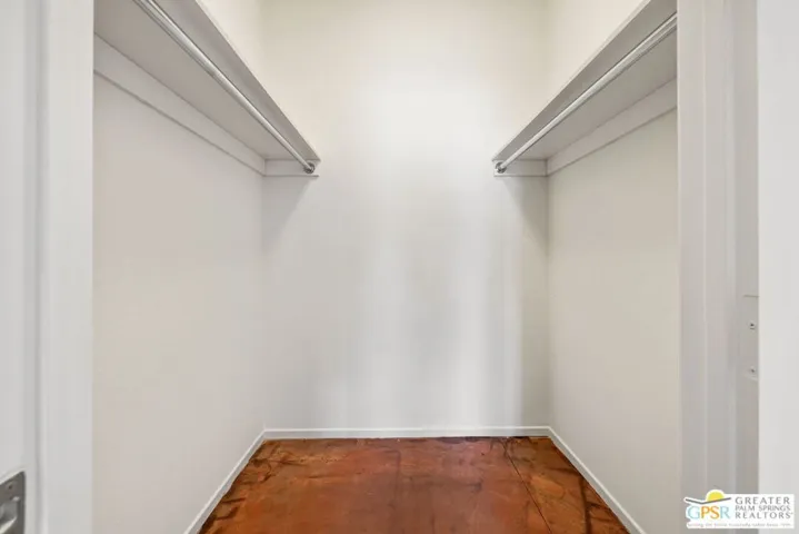 Modern desert living at its best in Palermo Palm Springs. This sleek and sophisticated single-level home impresses from the start with its private entry and two inviting courtyard patios perfectly framed by dramatic mountain views. Inside, stained concrete floors, soaring ceilings, and clerestory windows create a bright and open atmosphere that defines the Palm Springs lifestyle. The stylish kitchen flows easily to the living and dining areas, ideal for entertaining or quiet weekends away. The bedroom retreat features a large walk-in closet and direct access to the patio, while the spa-inspired bath offers a walk-in shower and modern finishes. Updates since 2024 include a new water heater, dishwasher, microwave, washer, dryer, ceiling fan, and fresh interior paint. Located within a gated community, this residence is just steps from one of the pools and spas and enjoys one of the best positions in Palermo with unobstructed west-facing mountain views. Residents enjoy resort-style amenities including a clubhouse, fitness center, two pools, and two spas. Fee Land (you own it) and just minutes from downtown Palm Springs make this the perfect full-time home, weekend escape, or investment opportunity. Take the Matterport Virtual Tour for a better sense of flow.