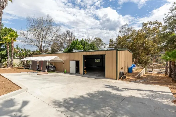 This 1+ acre property has numerous features that set it apart from the rest. Three full bathrooms, two separate garages (tandem & standard w/ two storage rooms), primary bedroom w/ two walk-in closets and ensuite bath with shower, tub and dual vanities, and a permitted 3000 sq ft steel building with 12ft walls and 10 ft roll-up door. The home was updated in 2014 by the previous owner with new windows, flooring and kitchen. The great room seamlessly flows from dining area into the living room with fireplace and the family room off the main entrance. Two outdoor patio areas, one covered with an outdoor pizza oven and counter. Parking galore with the long driveway leading to a large flat pad in front the two garages. Additional parking out back in front of the steel building. On top of all this there is still more space to grow into, both in front of the house and in the backyard. The home is serviced by a septic system, propane tank, and metered water hookups. Enjoy feeling removed from the city while having convenient freeway access and a quick drive into town for city amenities. Located just south of the Deer Springs exit off the I15 and a quick drive south to the north end of Centre City Parkway. If you love wine, this is your next home and Bella Marie Winery will be your next door neighbor! Want more trees? Moon Valley Nurseries is another nearby neighbor. A new CalFire station is under construction and nearing completion just up the road.