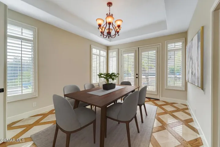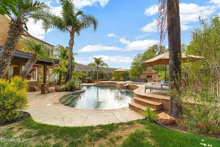 Welcome to this stunning 5 bedroom, 4.5 bath home boasting nearly 4000 sq. ft., ideally situated at the end of a private cul-de-sac on one of only two exclusive flag lots in the Deauville Tract. This residence offers unmatched privacy, panoramic views for miles, and a resort-style backyard designed for entertaining and everyday relaxation. Beautifully refreshed with new paint, plantation shutters, refinished hardwood floors, new carpet, recessed lighting, and new stainless-steel appliances, this home blends elegance and comfort in every detail.The open-concept kitchen features a center island, gas range, double oven, and walk-in pantry, flowing effortlessly into the spacious family room with a cozy fireplace and mirrored wet bar–perfect for entertaining or relaxing with loved ones. The formal dining room and living areas are bright and inviting, enhanced by French doors that open to the backyard, filling the home with natural light and a connection to the outdoors.The expansive primary suite is a private retreat, featuring a sitting area, dual closets, fireplace, and a spa-inspired bath with soaking tub and separate shower. Upstairs, you’ll find generously sized secondary bedrooms, beautifully updated bathrooms, and a versatile bonus room ideal for a home office, gym, or media space. Every inch of this thoughtfully designed home combines functionality with timeless style. The backyard is a true showpiece–an entertainer’s paradise surrounded by lush landscaping, palm trees, and fountains. Enjoy a covered patio with wood-beamed ceilings, tropical fans, and multiple seating areas overlooking the sparkling pool and spa. The outdoor fireplace creates the perfect gathering spot to unwind under the stars while taking in panoramic hillside and sunset views.Additional highlights include smart home features, dual-zone A/C, ceiling fans, ample storage, elegant architectural details, inviting courtyard and a spacious three-car garage. Energy efficiency shines with (2) fully owned Tesla solar systems which power the home bt two powerwall and another Thermal system to heat the pool, offering sustainability and savings. Set on one of the community’s premier lots, this home offers the rare combination of privacy, views, and luxury living that few properties in Moorpark can match. Move-in ready and meticulously maintained, this is truly a one-of-a-kind opportunity to own a home that checks every box–style, comfort, efficiency, and unmatched California outdoor living.