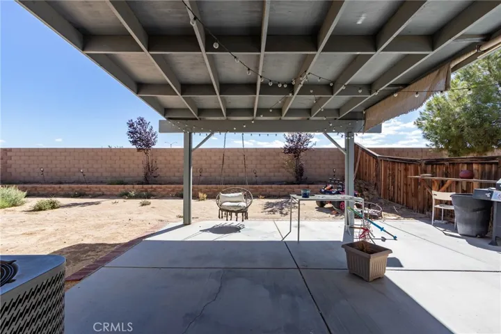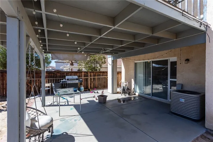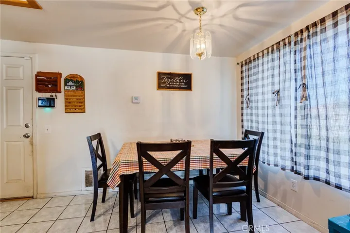 The dining room/kitchen and gathering spaces lead directly to a large backyard, where a covered patio offers a shaded retreat perfect for outdoor meals or casual lounging.