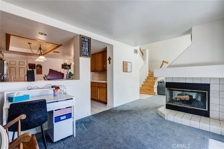 Inside, the space opens up with a seamless flow between the living and dining areas, anchored by a striking dual-sided fireplace—creating warmth and ambiance from every angle. The open layout encourages natural light to move freely through the home, enhancing both function and comfort.